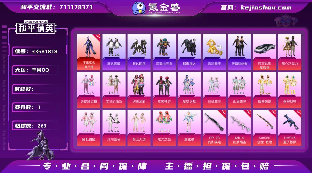 YZJ15095-可二次-苹果Q-1红装6稀有1载具17粉装17特效枪23热门【精氪神装素材号 可萌可身法 多款热门穿搭 萌妹系列套装多多 伤感小雾神套装 双子ID:拸悦 4级神装塞卢姆 巧克力三姐妹 猪妹 天网 都市 金鞋 权威小番茄 糯粉咩咩 胖达圆圆 胖达团团 发光眼罩 第五大道 绝对恒星 暖熊萌萌 奶油梦幻熊 兔兔白日梦 软软马卡龙 小黄鸭 粉团憨憨 萌趣戎叽 绒宝小鹅 蓝螳螂 小丑鱼 鲨鱼裤 双马尾 红眼罩 天命 3级M4墨龙九天 甜蜜誓约爱心背包 菠萝头 1级龙翔九天飞行器 粉雪蛇宝-伙伴 卡皮巴拉-伙伴 15款飞行器 7张改名卡】186套装263枪皮 89991热力值 14印记 历史卓越王牌13星 【1红装】 宇宙意志-塞卢姆 (4级) 【6稀有】 AKM-缤纷海域 都市猎人 浪漫天命 派对舞王 天网终结者 派对舞王(金靴子) 【1载具】 时空跃影(星辉银) 【17粉装】 超弦星 时空协奏心弦 宝贝奶油派 天使彩虹糖 甜心巧克力 炫光之旅 绝对恒星 垂柳戏鸭 缤纷油彩 放客神游 第五大道 星空之魅 冰川幽秘 暖熊萌萌 彩虹甜喵 山涧鹿灵 彩虹鹿灵 【17特效枪】 M416-墨龙九天 (3级) M416-电玩时刻 (5级) AKS-74U-森灵之息 (5级) AKM-绿萝繁花 (5级) Kar98K-巳巳如意 (5级) SPAS-12-蜜语绒猫 (3级) M762-青锋波束 (5级) D...