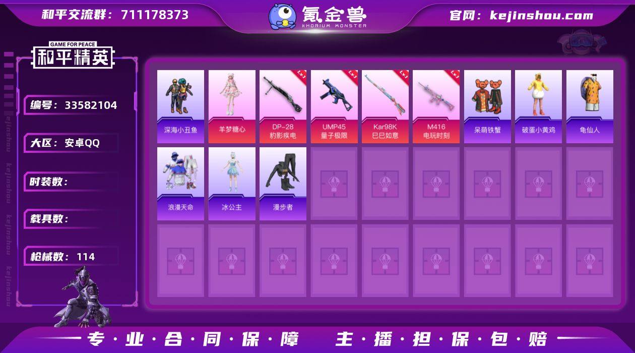 【特价出售/店主推荐】安卓 手Q-1粉装-6特效枪-2粉色飞行器-28554热力值-4王牌印记-84套装-114枪皮【热门品类】:套装-浪漫天命,套装-深海小丑鱼,套装-龟仙人【粉色套装】:角色-羊梦糖心【粉色枪皮等级】:M416-电玩时刻(五级),UMP45-量子极限(三级),UMP45-萌骑冒险(五级),Kar98K-巳巳如意(五级),Mk14-福马献瑞(五级),DP-28-豹影疾电(五级)【粉色枪皮】:M416-电玩时刻,UMP45-量子极限,UMP45-萌骑冒险,Kar98K-巳巳如意,Mk14-福马献瑞,DP-28-豹影疾电【粉色飞行器】:炫彩糖果飞行器,极意拳锋飞行器