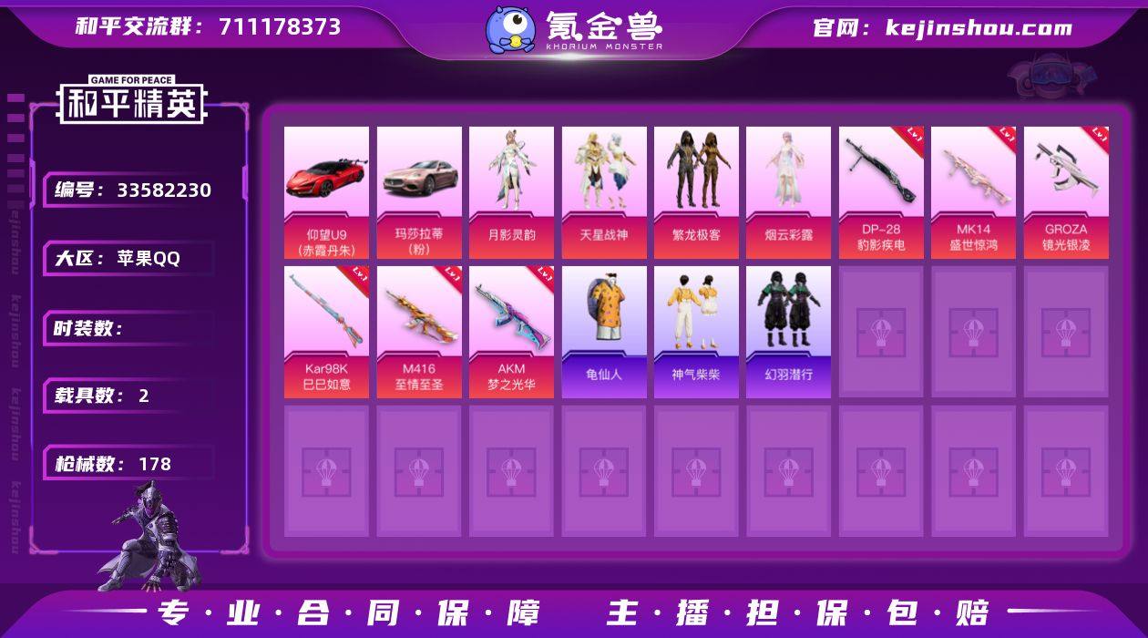 可二次【M4满级至情至圣AKM满级梦之光华9特效枪2载具4粉装 秒换绑不用等】 苹果Q区-55963热力值-109套装-178枪皮 【2载具】 玛莎拉蒂Ghibli(粉) 仰望U9(赤霞丹朱)【1稀有】 奇异狩猎者【4粉装】 繁龙极客 天星战神 角色-烟云彩露 角色-月影灵韵【9特效枪】 M416-至情至圣(9级) Mk14-盛世惊鸿(3级) AKM-梦之光华(7级) AKS-74U-森灵之息(5级) Mk14-福马献瑞(5级) PKM-萌骑夺宝(3级) Kar98K-巳巳如意(5级) GROZA-镜光银凌(5级) DP-28-豹影疾电(5级)【159热门】 迅捷狂鲨 SS27特训 SS26特训 SS25特训 SS24特训 SS22特训 Kar98K-王子的夏天 SCAR-L-玉兔迎春 M762-天降萌叽 M762-彩虹符号 Mk47-乌木金纹 Mini14-旋转彩虹 UZI-娇憨猪猪 S12K-垂柳戏鸭 MG3-幻世战舞者 AKM-霓虹街区 鹰眼刺客 破蛋小黄鸡 长空猛禽 弄潮海豚 虚音幻奏 甜心亚梦 牛气冲天 懵萌河马 坚韧舞者 黄色运动 漫步者 海岛探路者 纯真浪花 AKM-奇异狩猎者 S1897-糯团青竹 AA12-G-雨过天青 沙漠之鹰-雨过天青 Mini14-绯穹魔姬 海琴烟 GROZA-紫矿核心 M16A4-雨过天青 顶瓜瓜 雨过天青 MG-36-薄荷星砂 GROZA-福马献瑞 SS34特训 朱霞炽焰 AWM-天降萌叽 怀庆长公主 福马献瑞 SS20特训 SS21特训 凌霄紫焰 SS30特训 ACE32...
