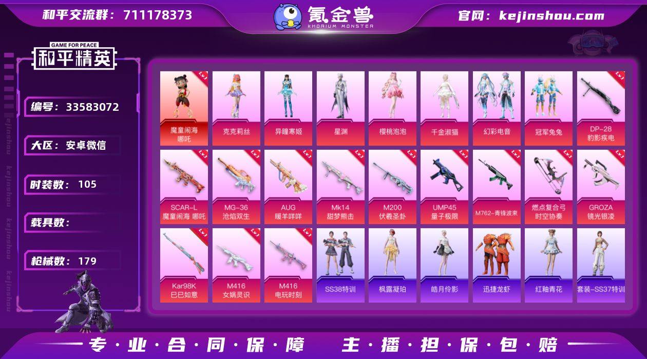 【2级哪吒红眼罩13特效枪7粉装1集结舱】 安卓V区-59801热力值-105套装-179枪皮 【1红装】 魔童闹海-哪吒(2级)【2稀有】 AWM-黄金龙骨 红眼罩【7粉装】 克克莉丝 角色-樱桃泡泡 冠军兔兔 角色-异瞳寒姬 幻彩电音 角色-星渊 角色-千金淑猫【13特效枪】 M416-女娲灵识(3级) M762-青锋波束(5级) Kar98K-巳巳如意(5级) Mk14-甜梦熊击(5级) AUG-暖羊咩咩(5级) M416-电玩时刻(5级) GROZA-镜光银凌(5级) DP-28-豹影疾电(5级) MG-36-沧焰双生(5级) SCAR-L-魔童闹海 哪吒(3级) UMP45-量子极限(5级) M200-伏羲圣卦(5级) 燃点复合弓-时空协奏(4级)【225热门】 暗影哥特(红眼罩) 浪漫天命 小丑鱼 狂沙舞者 SS27特训 M249-彩虹符号 鹰眼刺客 长空猛禽 弄潮海豚 青涩时光 漫步者 黑色伏地魔 海岛探路者 纯真浪花 兔兔白日梦 SPAS-12-行星泡泡 S1897-糯团青竹 AA12-G-雨过天青 沙漠之鹰-雨过天青 GROZA-紫矿核心 M16A4-雨过天青 MP5K-未来领航者 绯夜呢喃 破片手榴弹-克克莉丝 撬棍-克克莉丝 雨过天青 F57-魔童闹海 敖闰 冰河战士 燃点复合弓-火尖莲影 旱漠游骑 雏菊兔兔 破片手榴弹-火尖莲影 Vector-涂鸦狂喜 恋语绒绒 撬棍-火尖枪 SS34特训 玩偶服-美羊羊 鲛海歌灵 朱霞炽焰 次元竞界 S1897-...