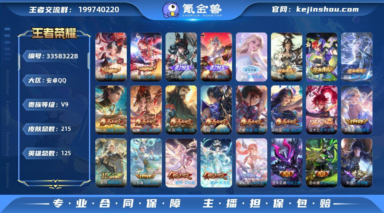 安卓Q-V9-至尊星耀III段位-125英雄-215皮肤-2典藏皮肤-3无双-3珍品传说-35传说-74史诗 【英雄全皮】:不知火舞全皮,敖隐全皮,空空儿全皮,影全皮 【荣耀典藏】:瑶拾光映像,安琪拉颠倒童话魔镜 【无双皮肤】:甄姬雪境奇遇,公孙离离恨烟,不知火舞花合斗 【珍品传说】:伽罗沧流箭,嫦娥器灵落星盏,孙策时之奇旅 【传说皮肤】:云缨神骥越千峰,关羽神骥镇沧海,朵莉亚神骥鸣幻洲,狄仁杰神骥赴朔漠,貂蝉神骥聚万邦,马超神骥逐星野,花木兰异界灵契,王昭君长夜焕生,后羿神树通天,公孙离云诺千山,后羿千劫归真,妲己愿照众生和,虞姬愿照岁时盈,朵莉亚心动手记,海月金乌负日,露娜霜月吟,甄姬至美化雀舞,大乔时之奇旅,上官婉儿妄想奇谈,公孙离记忆之芯,小乔山海琳琅生,吕布怒海麟威,不知火舞绯月行,王昭君星穹之声,孙尚香音你闪耀,露娜启示之音,孙尚香异界灵契,王昭君乞巧织情,西施游龙清影,小乔音你心动,虞姬启明星使,李信一念神魔,虞姬云霓雀翎,孙尚香末日机甲,宫本武藏地狱之眼 【限定皮肤】:公孙离离恨烟,暃埋骨钱,蒙犽顽岩魄,蔡文姬夏日便利店,虞姬夏日便利店,姜子牙天穹之誓,狄仁杰阴阳师,小乔山海琳琅生,赵云皇家上将,妲己热...
