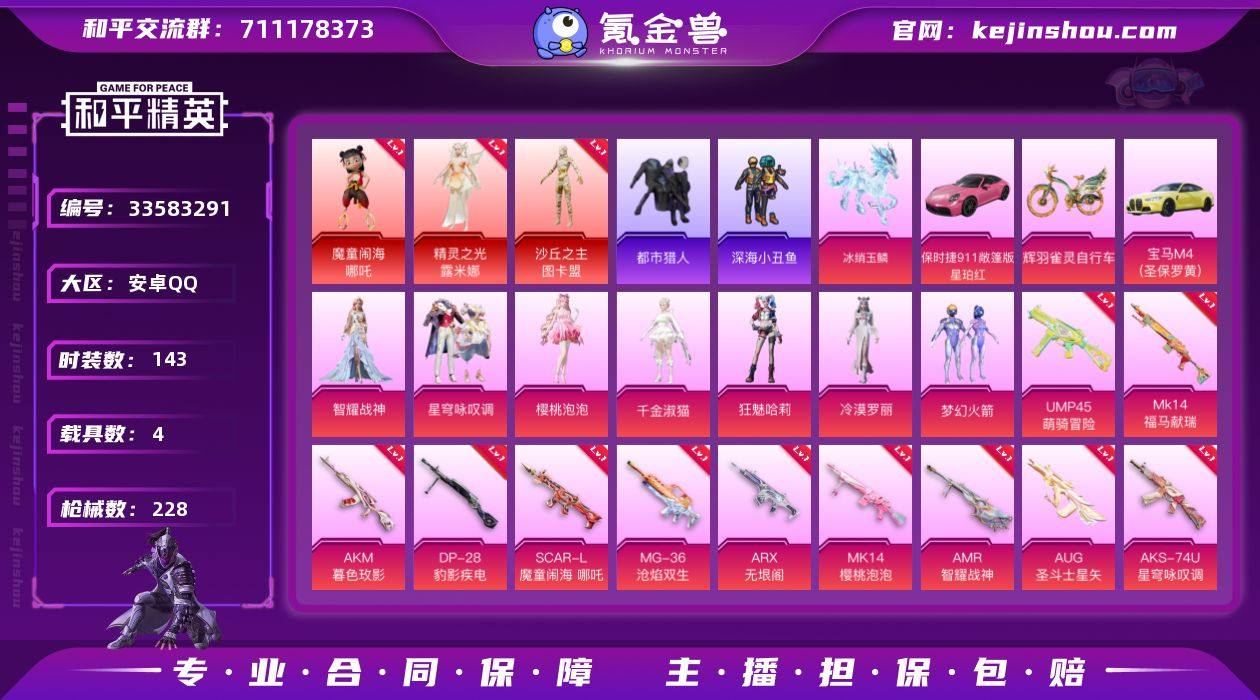 【3红装4级图卡盟小丑女都市猎人18特效枪8粉装4载具素材号 秒换绑不用等】 安卓Q区-82611热力值-143套装-228枪皮 【3红装】 沙丘之主-图卡盟(4级) 魔童闹海-哪吒(1级) 精灵之光-露米娜(1级)【4载具】 宝马M4(圣保罗黄) 辉羽雀灵自行车 冰绡玉鳞 保时捷911 敞篷版(星珀红)【2稀有】 都市猎人 红眼罩【8粉装】 狂魅哈莉(小丑女) 梦幻火箭 缤纷油彩(猪脸妹) 角色-冷漠罗丽 角色-樱桃泡泡 角色-智耀战神 星穹咏叹调 角色-千金淑猫【18特效枪】 MG3-辉羽雀灵(3级) AKM-暮色玫影(3级) Mk14-福马献瑞(5级) UMP45-萌骑冒险(3级) ARX-无垠阁(4级) 蜜獾-荧海星豚(4级) 汤姆逊-热量炸弹(5级) Mk14-樱桃泡泡(4级) DP-28-千金淑猫(2级) AMR-智耀战神(4级) AUG-圣斗士星矢(5级) 破片手榴弹-美味星星糖(7级) Kar98K-巳巳如意(5级) AKS-74U-星穹咏叹调(5级) Mk14-甜梦熊击(5级) DP-28-豹影疾电(5级) MG-36-沧焰双生(4级) SCAR-L-魔童闹海 哪吒(3级)【232热门】 深海小丑鱼 暗影哥特(红眼罩) 浪漫天命 都市猎人(蓝口罩) 雪山精英(老6服) 小丑鱼 迅捷狂鲨 极速红龙 冰川格斗者 SS6特训 M762-乌木金纹 AKM-缤纷海域 M416-乌木金纹 GROZA-乌木金纹 UMP45-蓝色火焰 M249-彩虹符号 MG3-幻世战舞...