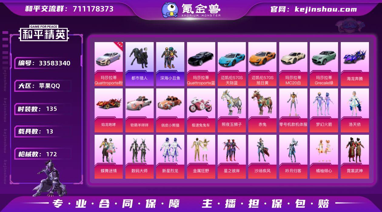 可二次实名【14载具26粉装9特效枪3级玛莎星双色螳螂都市男神素材号 秒换绑不用等】 苹果Q区-76915热力值-135套装-172枪皮 【14载具】 玛莎拉蒂Q幻星粉(3级) 玛莎拉蒂M白色 玛莎拉蒂G绿色 玛莎拉蒂Q蓝色 焰龙咆哮 海龙奔腾 软萌羊咩咩 赤兔 照夜玉狮子 迈凯伦570S(天际蓝) 迈凯伦570S(旭日黄) 俏皮小熊猫 极速兔兔车 萌兔起飞僚机【3稀有】 都市猎人 Mark.06蓝螳螂 8号机粉螳螂【26粉装】 零号机款机体服(黄螳螂) 角色-初号机 觉醒Ver. 梦幻火箭 缤纷油彩(猪脸妹) 洛天依 沙场疾风 数码大师 星之彼岸 旋转彩虹 蝶舞迷情 金属狂野 橘柚倾心 霓裳武神 新星烈龙 憨憨奶龙 莲影清波 熔岩统帅 冰炎战车 紫钛骑兵 吟月归客 光明术士 银红美神 碧穹智者 青空秋雨 朗月武圣 鸾凤武仙【9特效枪】 AKM-星际浪客(5级) AWM-橘柚倾心(4级) 野牛-青空秋雨(5级) MK20-H-海螺星光(2级) M24-翩跹演武(2级) GROZA-旋转彩虹(6级) MG3-洛神天依(7级) AKM-绿萝繁花(5级) DP-28-豹影疾电(5级)【138热门】 深海小丑鱼 暗影哥特(红眼罩) 浪漫天命 雪山精英(老6服) 好奇恐龙 军刀雅典娜 白色伏地魔 SS27特训 SS26特训 SS24特训 SS22特训 Mk47-洛神天依 Mini14-梦幻火箭 M762-橘柚倾心 M24-未来战士 M...