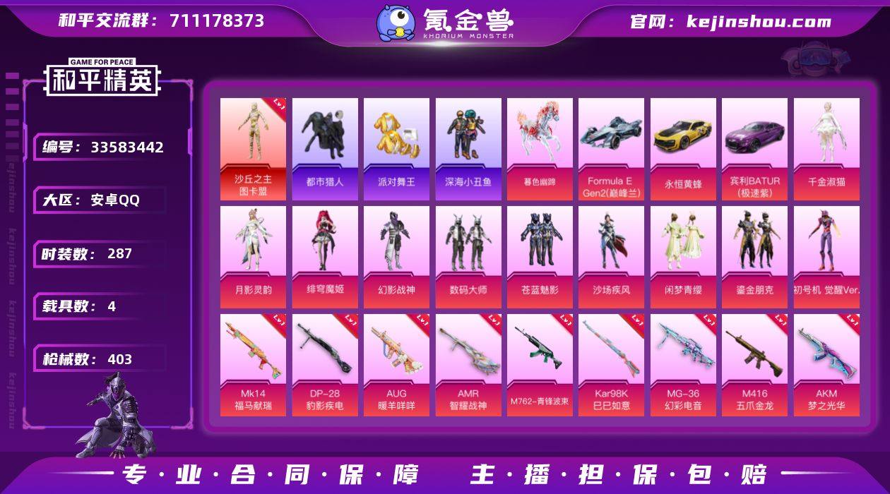 【4级图卡盟螳螂金鞋都市男神12特效枪10粉装4载具身法素材号 秒换绑不用等】 安卓Q区-132306热力值-287套装-403枪皮 【1红装】 沙丘之主-图卡盟(4级)【4载具】 宾利BATTUR(极速紫) 永恒黄蜂 Formula E Gen2(巅峰兰) 暮色幽蹄【4稀有】 都市猎人 派对舞王(金靴子) 奇异狩猎者 8号机粉螳螂【10粉装】 角色-初号机 觉醒Ver. 沙场疾风 数码大师 闲梦青缨 幻影战神 苍蓝魅影 角色-月影灵韵 角色-绯穹魔姬 鎏金朋克 角色-千金淑猫【12特效枪】 P90-沙丘之主(3级) M416-五爪金龙(7级) AKM-梦之光华(7级) Mk14-福马献瑞(4级) M249-蓝莓炮弹(7级) AKM-绿萝繁花(5级) M762-青锋波束(5级) AMR-智耀战神(7级) Kar98K-巳巳如意(5级) AUG-暖羊咩咩(5级) DP-28-豹影疾电(5级) MG-36-幻彩电音(5级)【354热门】 深海小丑鱼 都市猎人(蓝口罩) 雪山精英(老6服) 好奇恐龙 迅捷狂鲨 裁决冥王 极速红龙 团圆交子 瑞龙福将 M416-快乐主宰 缤纷焰火 白色伏地魔 SS9特训 SS6特训 SS3特训 SS2特训 SS27特训 SS26特训 SS25特训 SS24特训 SS23特训 SS22特训 SS10特训 Mk47-洛神天依 Mini14-梦幻火箭 M762-乌木金纹 Kar98K-王子的夏天 AWM-雷霆特警 M416-乌木金纹 SCAR-L-玉兔迎春 GROZA-田园牧歌 M762-...