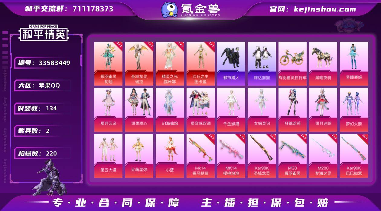 可二次实名【4红装4级图卡盟战神框小丑女都市猎人14粉装8特效枪2载具素材号 秒换绑不用等】 苹果Q区-80820热力值-历史最高段位:无敌战神-134套装-220枪皮 【4红装】 沙丘之主-图卡盟(4级) 辉羽雀灵-初翊(1级) 精灵之光-露米娜(1级) 圣域龙灵-瑞拉(1级)【2载具】 黑曜夜骑 辉羽雀灵自行车【4稀有】 都市猎人 胖达圆圆卤蛋头 Mark.06蓝螳螂 8号机粉螳螂【14粉装】 狂魅哈莉(小丑女) 梦幻火箭 缤纷油彩(猪脸妹) 第五大道 呆萌星弥 绯果甜心 角色-异瞳寒姬 角色-小蓝 角色-绯月迷踪 星月云朵 星穹咏叹调 角色-幻海仙踪 角色-女娲灵识 角色-千金淑猫【8特效枪】 M416-墨龙九天(3级) Kar98K-圣域龙灵(3级) M200-梦海之灵(2级) MG3-辉羽雀灵(3级) P90-沙丘之主(3级) Mk14-福马献瑞(5级) Mk14-樱桃泡泡(3级) Kar98K-巳巳如意(5级)【252热门】 胖达圆圆 都市猎人(蓝口罩) 小丑鱼 SS27特训 SS26特训 SS25特训 SS22特训 Mk47-洛神天依 Mini14-梦幻火箭 AKM-缤纷海域 SCAR-L-玉兔迎春 UMP45-蓝色火焰 DBS-彩虹符号 MG3-幻世战舞者 AKM-霓虹街区 AKM-春暖花开 鹰眼刺客 M416-蓝色火焰 破蛋小黄鸡 长空猛禽 特训学院 青涩时光 霓虹街区 魅力单车 漫步者 纯真浪花 春日漫步 S1897-糯团青...