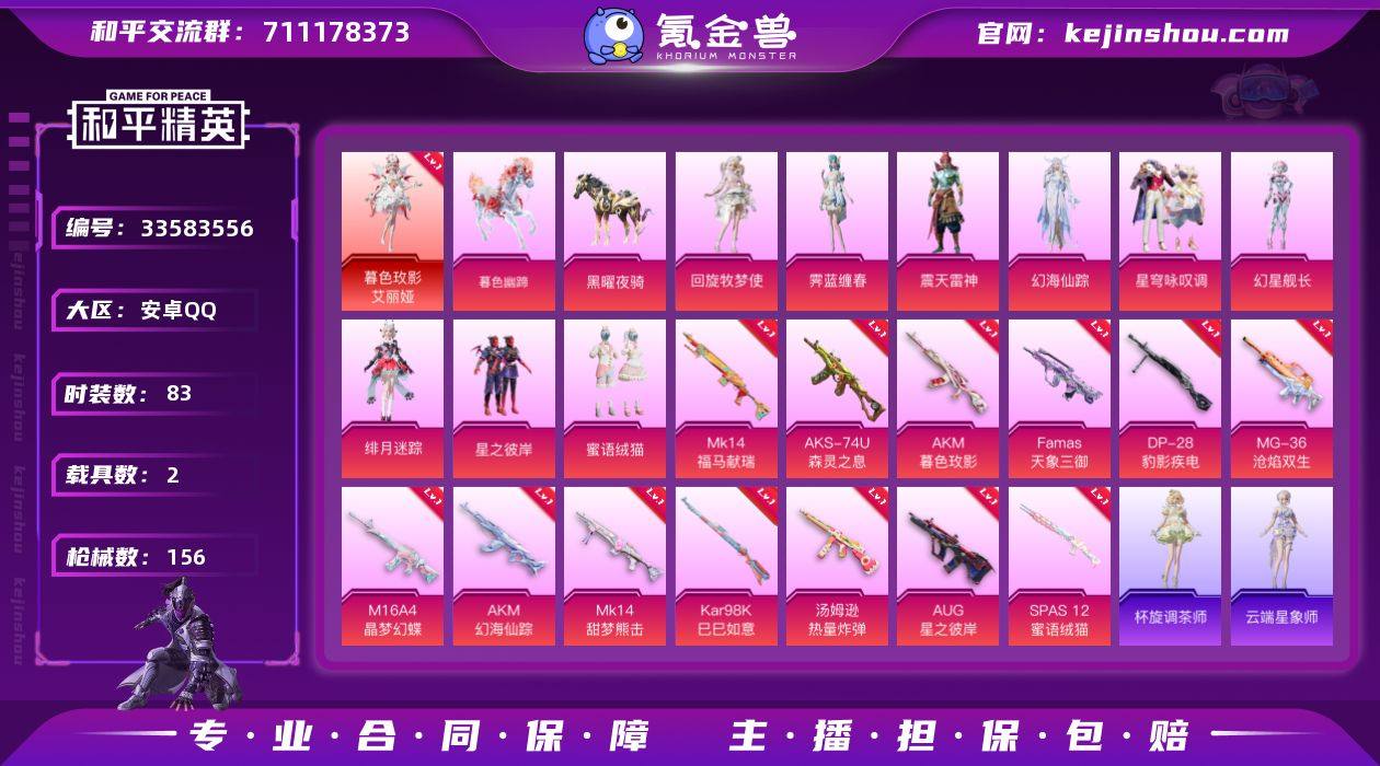 可二次实名【女号1红装13特效枪9粉装2载具 秒换绑不用等】 安卓Q区-53444热力值-83套装-156枪皮 【1红装】 暮色玫影-艾丽娅(1级)【2载具】 暮色幽蹄 黑曜夜骑【9粉装】 蜜语绒猫 星之彼岸 霁蓝缠春 震天雷神 回旋牧梦使 角色-绯月迷踪 星穹咏叹调 角色-幻海仙踪 角色-幻星舰长【13特效枪】 AKS-74U-森灵之息(5级) AKM-暮色玫影(3级) Mk14-福马献瑞(5级) Famas-天象三御(5级) AUG-星之彼岸(5级) 汤姆逊-热量炸弹(5级) M16A4-晶梦幻蝶(7级) AKM-幻海仙踪(2级) SPAS-12-蜜语绒猫(2级) Kar98K-巳巳如意(5级) Mk14-甜梦熊击(5级) DP-28-豹影疾电(5级) MG-36-沧焰双生(5级)【195热门】 迅捷狂鲨 AKM-缤纷海域 SCAR-L-玉兔迎春 M762-彩虹符号 SKS-糯团青竹 AKM-星之彼岸 汤姆逊-智耀战神 S1897-糯团青竹 萌趣绒叽 AA12-G-雨过天青 SCAR-L-小狗蛇点点 沙漠之鹰-雨过天青 Mini14-绯穹魔姬 平底锅-画境星梦 P90-紫矿核心 馥郁金蕊 P90-魔法小松鼠 玩偶服-小狗蛇点点 AWM-暮色玫影 M16A4-雨过天青 顶瓜瓜 SPAS-12-福马献瑞 SLR-天象三御 雨过天青 MG-36-薄荷星砂 GROZA-福马献瑞 SS34特训 幽澜祭司 鲛海歌灵 漫游都市 朱霞炽焰 星渊小夜曲 撬棍-冰晶雪宝 福马献瑞 大橘大利 M200-罪夜之冕...