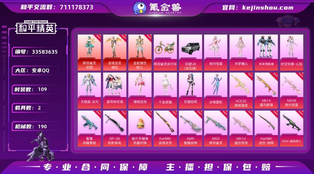 【3红装1个4级 小丑女14特效枪10粉装2载具素材号 秒换绑不用等】 安卓Q区-69017热力值-109套装-190枪皮 【3红装】 金蛇镇世-烛九(1级) 辉羽雀灵-初翊(1级) 圣域龙灵-瑞拉(4级)【2载具】 仰望U8(龙石绿) 辉羽雀灵自行车【10粉装】 狂魅哈莉(小丑女) 绝对恒星 角色-冰域雷影 角色-樱桃泡泡 星穹咏叹调 角色-天鹅座 冰河 时空协奏·心弦 角色-羊梦糖心 未来领航者 角色-千金淑猫【14特效枪】 Kar98K-圣域龙灵(3级) AKM-幽焰骑士(3级) Mk14-盛世惊鸿(3级) MG3-辉羽雀灵(3级) Mk14-福马献瑞(1级) ACE32-萌骑漫游(5级) M249-绝对恒星(1级) 破片手榴弹-热量炸弹(7级) Kar98K-创世·救赎(5级) 蜜獾-异瞳寒姬(1级) AMR-智耀战神(3级) SVD-月影灵韵(4级) Kar98K-巳巳如意(5级) DP-28-豹影疾电(1级)【234热门】 M762-天降萌叽 M762-彩虹符号 DBS-彩虹符号 青涩时光 拉斐尔 黄色伏地魔 短管霰弹-宇宙意志 MK12-金蛇镇世 S1897-糯团青竹 创世·幻影 AA12-G-雨过天青 沙漠之鹰-雨过天青 平底锅-画境星梦 超感刻度 海琴烟 P90-紫矿核心 暗夜风云 GROZA-紫矿核心 玲珑侠影 M16A4-雨过天青 顶瓜瓜 Vector-荒原烈焰 白辉玉蕊 雨过天青 冰河战士 MG-36-薄荷星砂 GROZA-福马献瑞 恋语绒绒 SS34特训...