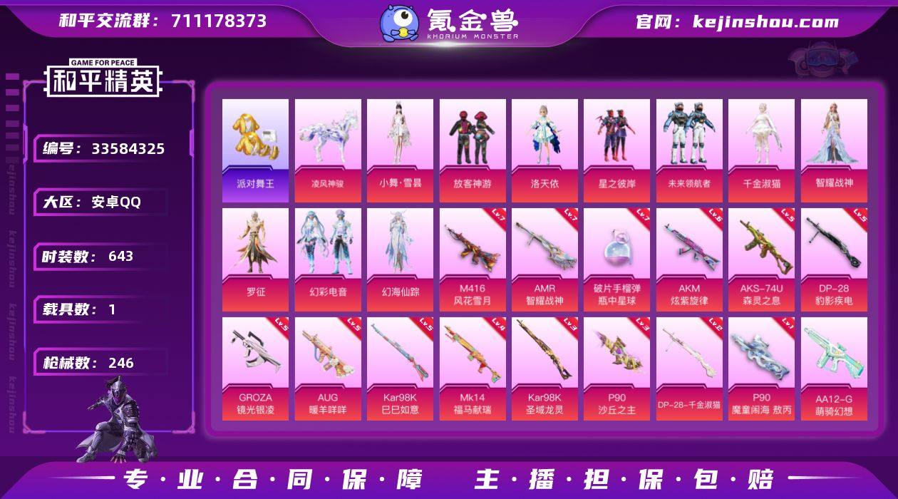 实名: 可修改 时装数: 643 载具数: 1 枪械数: 246 战备数: 1 热门装扮: 浪漫波比,放客神游,鹰眼刺客,东方飞龙,星之彼岸,洛天依,派对舞王,未来领航者,千金淑猫,智耀战神,幻海仙踪,幻彩电音,罗征,小舞·雪昙 载具: 凌风神骏 稀有枪皮: AKM炫紫旋律,M416风花雪月,P90沙丘之主,DP-28-千金淑猫,GROZA-镜光银凌,Kar98K-巳巳如意,AUG-暖羊咩咩,Kar98K-圣域龙灵,AMR-智耀战神,破片手榴弹-瓶中星球,DP-28-豹影疾电,P90-魔童闹海 敖丙,AKS-74U-森灵之息,MK14-福马献瑞,AA12-G-萌骑幻想 亮点: 【优质装备】:派对舞王(小金鞋),舞王派对(派对舞王、小金鞋),七级M416-风花雪月,七级AMR-智耀战神,七级破片手榴弹-瓶中星球