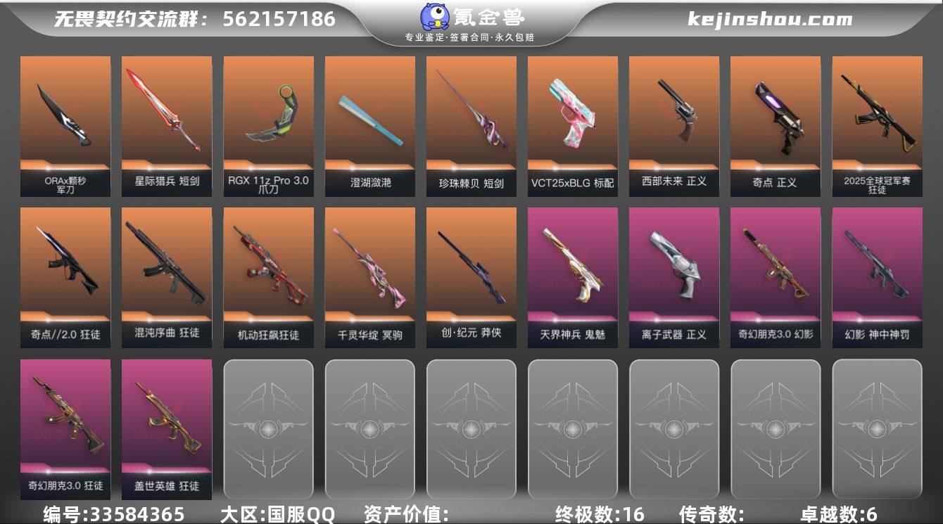【953168】【英雄】:幻棱,炼狱,维斯,暮蝶,钛狐,壹决,铁臂,捷风,雷兹,幽影,不死鸟,贤者,猎枭,蝰蛇,零,芮娜,奇乐,尚勃勒,霓虹,斯凯,夜露,星礈,K/O,海神,盖可,黑梦 【近战武器】:近战武器-碎心裂刃,近战武器-ORA x 颗秒 军刀,近战武器-魔术火花,近战武器-RGX 11z Pro//3.0 爪刀,近战武器-澄湖潋滟,近战武器-珍珠棘贝 短剑,近战武器-星际猎兵 短剑,近战武器-魔术火花 【狂徒】:狂徒-2025全球冠军赛,狂徒-混沌序曲,狂徒-机动狂飙,狂徒-奇点//2.0,狂徒-盖世英雄,狂徒-奇幻朋克//3.0,狂徒-流星兵团 【幻影】:幻影-神中神罚,幻影-奇幻朋克//3.0,幻影-珍珠棘贝 【戍卫】:戍卫-珍珠棘贝,戍卫-战术熊与伙伴们 【獠犬】:獠犬-复古浪潮 【冥驹】:冥驹-千灵华绽,冥驹-复古浪潮 【飞将】:飞将-战术熊与伙伴们 【莽侠】:莽侠-创·纪元,莽侠-深海水族,莽侠-纤云弄巧 【战神】:战神-深海水族 【奥丁】:奥丁-流星兵团 【雄鹿】:雄鹿-复古浪潮 【骇灵】:骇灵-流星兵团,骇灵-珍珠棘贝,骇灵-无限竞技 【蜂刺】:蜂刺-深海水族,蜂刺-纤云弄巧 【标配】:标配-超能偶像,标配-战术熊与伙伴们 【VCT手枪】:标配-VCT25 x BLG 【正义】:正...