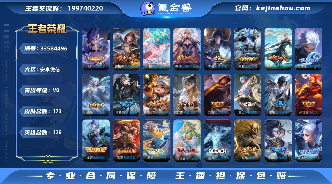 实名: 可修改 性别: 男号 贵族等级: V8 英雄数: 128 皮肤数: 173 荣耀水晶: 天鹅之梦 传说皮: 一念神魔,云霓雀翎,地狱火,时之恋人-刘备,游龙清影,淬星耀世,无双飞将,神器·狴犴令,山海·炽霜斩,鹤羽星尊,乘龙·铭钟鼎 限定皮: 引擎之心,龙胆,烈魂,虎魄,神威,飞衡,逐梦之影,寅虎·御盾,默契交锋-兰陵王,默契交锋-花木兰,寅虎·瑞焰,傲雪梅枪,寅虎·赤拳,寅虎·心曲,寅虎·展翼,时之祈愿-瑶,百木心枪,五谷丰年 亮点: 【优质装备】:天鹅之梦(小乔典藏),一念神魔,云霓雀翎,地狱火,时之恋人-刘备(电焊工),游龙清影(小青龙),淬星耀世,无双飞将,神器·狴犴令,山海·炽霜斩(李信年限),鹤羽星尊,涂山容容