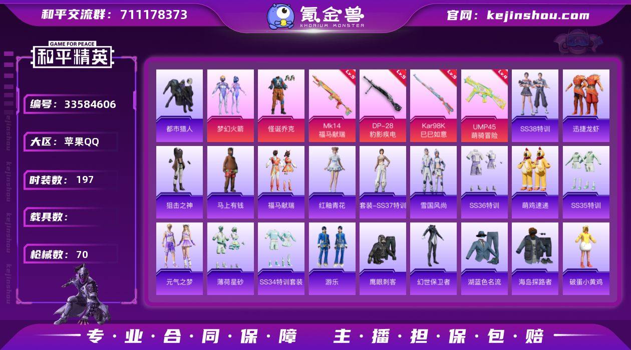 精氪素材号/小雾神同款【小丑/都市/火箭少女/浪漫天命】满级mk14/小熊背包/巧克力头盔/地铁45点天赋 实名: 可修改 时装数: 197 枪械数: 70 战备数: 41 热门装扮: 梦幻火箭(新101),怪诞乔克,鹰眼刺客,都市猎人 稀有枪皮: Kar98K-巳巳如意,DP-28-豹影疾电,UMP45-萌骑冒险