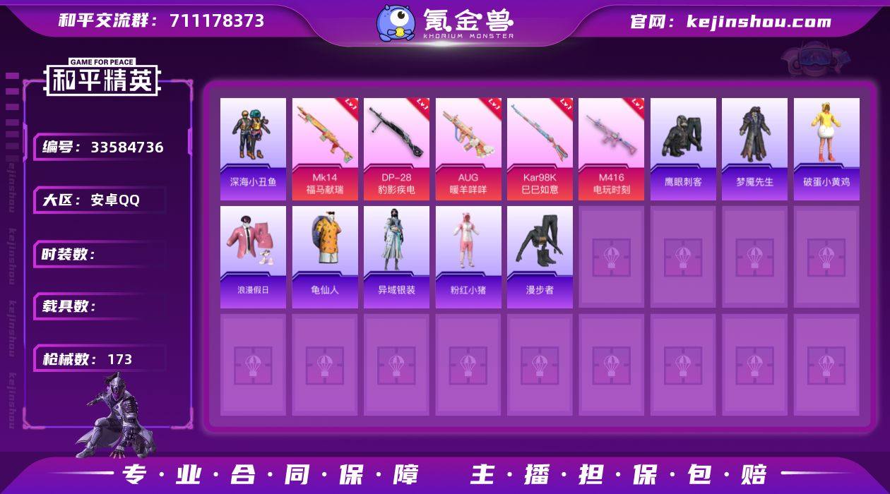 XS11580安卓手Q-2粉装-7特效枪-137套装-173枪皮-13王牌印记-超级王牌4星-46549热力值【2粉装】角色-六号石头人,角色-异瞳寒姬【7特效枪】DP-28-豹影疾电[5级],Mk14-福马献瑞[5级],AUG-暖羊咩咩[5级],M416-电玩时刻[5级],ACE32-萌骑漫游[4级],信号枪-金乌曜日[5级],Kar98K-巳巳如意[5级]【2稀有】深海小丑鱼,AKM-百万伏特【7飞行器】马上有福飞行器,炫彩糖果飞行器,幻骨萌王飞行器,狂鲨锋刃飞行器,鸡智如我飞行器,光之冒险尾迹,异域银装飞行器【1头盔】深海小丑鱼头盔【299其它衣服和枪皮】SS24特训,画境星梦,SS20特训,暗金炫舞,战术大师,夏日音浪,沙漠毒蛇,粉红小猪,完美偶像,魅力单车,冰河战士,猎鹰,SS23特训,战地督导,黄色名流,锦衣飞扬,书海巡游,青玉碎影,锦灰蝶梦,猛禽,元素星魂,绯格组合,狂鲨锋刃,SS31特训,福星高照,龟仙人,深蓝色名流,浪漫假日,海盐绵绵冰,柠萌假日,惊鸿侠骨,遗迹猎人,街头潮人,野性战心,湖畔霞光,橘黑制服,漫游都市,冷焰舞者,雨过天青,角色-魂电,SS19特训,SS25特训,青翼流星,甜蜜告白,长空猛禽,都市魅力,清新柠檬,SS35特训,冰冻风暴,SS28特训,森林游猎者,梦魇先生,狙击之神,SS33特训,SS38特训,人气偶像,黄色运动,青年教官,酒红色名流,幻世战舞者,灼焰...