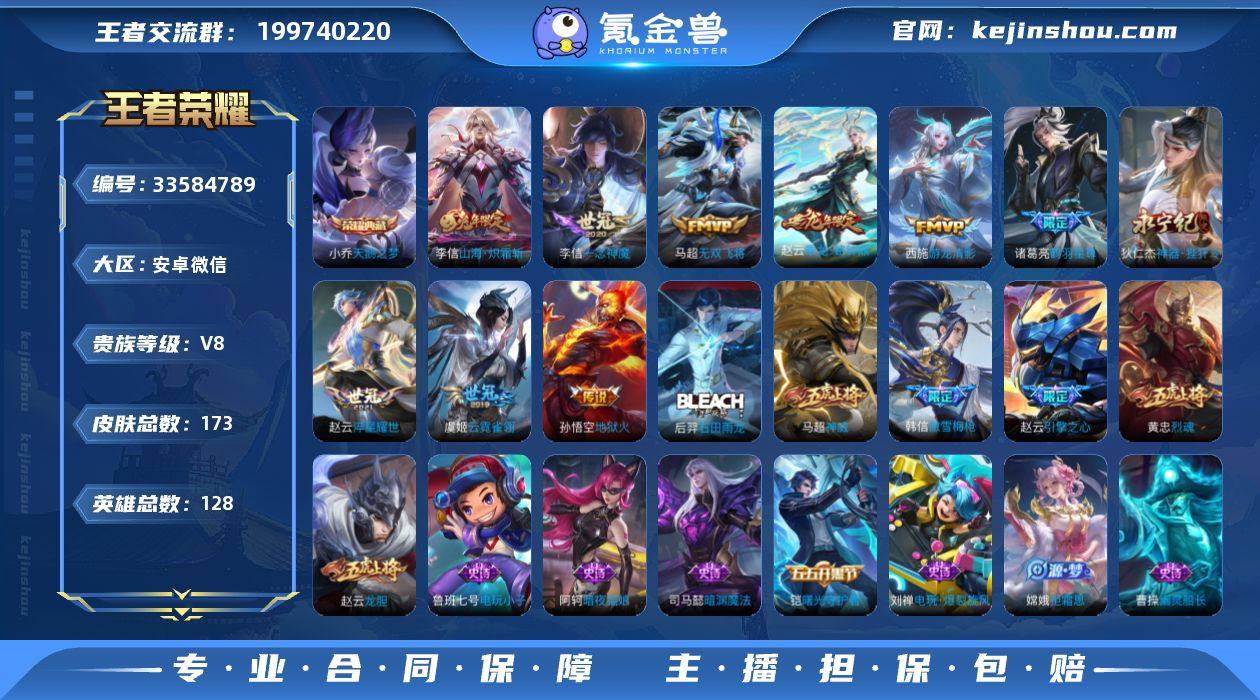 V8 1典藏 16传说 128英雄 173皮肤 可二次 可修改实名 男号 【英雄全皮】赵云全皮,大禹全皮 【稀有英雄】大司命,嬴政(始皇帝),韩信(韩跳跳),夏洛特(夏师傅),艾琳,橘右京(橘子),娜可露露(鸟人),不知火舞,赵云,金蝉(唐僧),戈娅 【荣耀水晶】天鹅之梦(小乔典藏) 【传说皮】乘龙·铭钟鼎(赵云年限),游龙清影(小青龙),山海·炽霜斩(李信年限),地狱火,云霓雀翎,一念神魔,淬星耀世,无双飞将,时之恋人-刘备(电焊工),神器·狴犴令,鹤羽星尊 【珍宝阁皮】优雅恋人 【赛季/战令皮】星界游侠,海盐诗旅(s30),擒涛扼浪(s31),潮玩骑兵,奇幻香踪,探海日志(s32),顽趣-梦奇,天穹祈灯(s34),天穹之誓(s36),暖冬·兔眠,万华元夜(s22),演武夺筹(s23),驱傩正仪(s24),千军破阵(s25),星际陆战队-达摩,胡桃异想国,神迹守卫-墨子,航海奇遇记,圣弓游侠,真爱魔法,火炮绅士,沙漠行僧(s26),幻夜卜梦,夜都怪侠,金庭之子(s27),大漠名商(s28),云中旅人(s29),超时空战士-钟无艳,落雪兰心 【史诗皮】线条小狗-周瑜,九幽镇关,涂山容容,石田雨龙,电玩小子(小书包),白龙吟,黄金分割率,特工魅影,千年之狐,蒙恬荣光圣徽,冰冠公主,偶像歌手,暗夜猫娘,电玩·爆裂旋风,乱世虎臣,水果甜心,星夜王子,心灵骇客,幽灵船长,鬼剑武藏,暗...