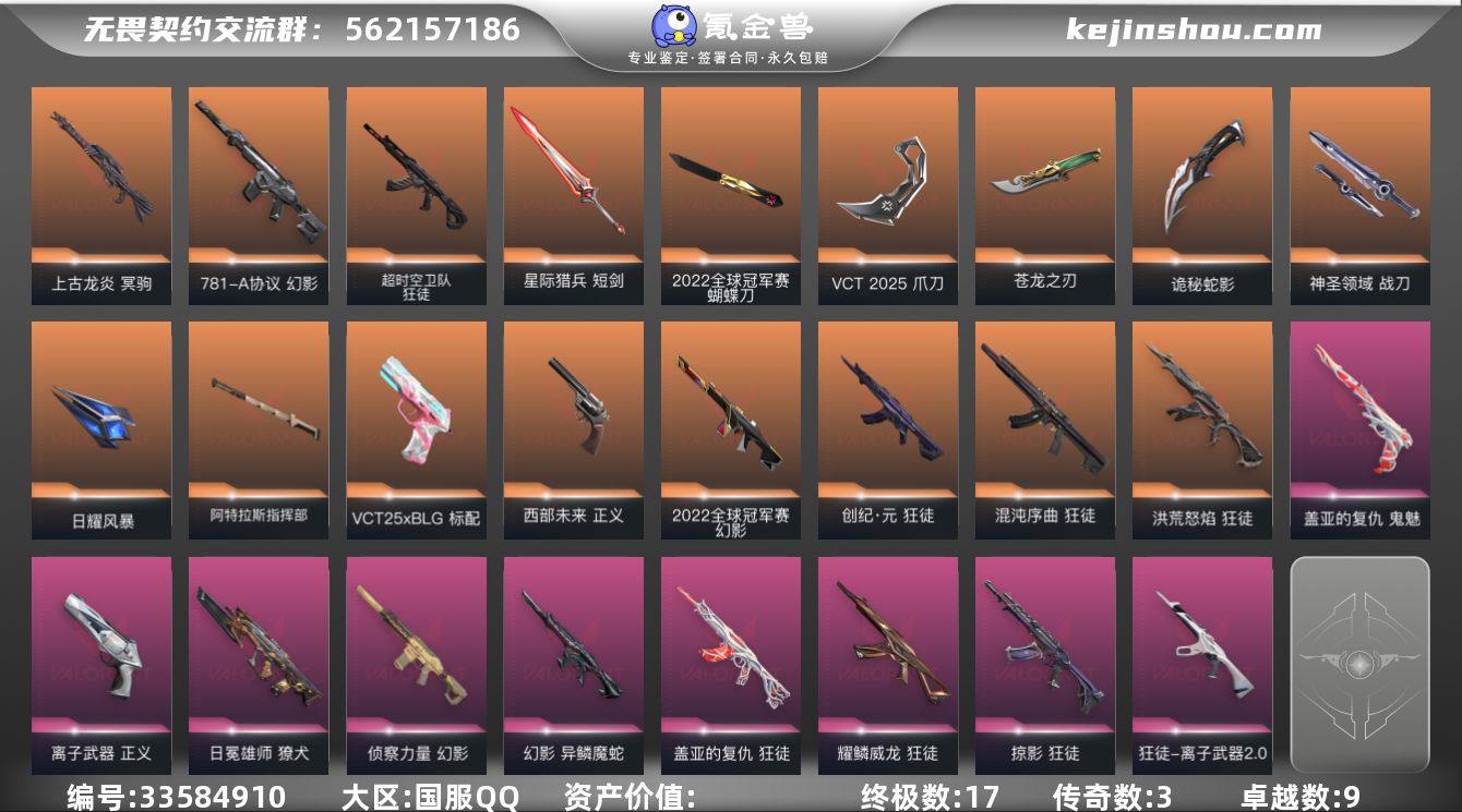 【953158】【套装】:2022全球冠军赛套装,VCT 2025 赛季套装 【英雄】:幻棱,炼狱,维斯,暮蝶,钛狐,壹决,铁臂,捷风,雷兹,幽影,不死鸟,贤者,猎枭,蝰蛇,零,芮娜,奇乐,尚勃勒,霓虹,斯凯,夜露,星礈,K/O,海神,盖可,黑梦,钢锁 【近战武器】:近战武器-2022全球冠军赛 蝴蝶刀,近战武器-5周年//公测重制版 苍龙之刃,近战武器-VCT 2025 爪刀,近战武器-落英飞旋,近战武器-镭切,近战武器-鬼丸国纲,近战武器-诡秘蛇影 军刀,近战武器-神圣领域 战刀,近战武器-日耀风暴 遗器,近战武器-阿特拉斯指挥部 甩棍,近战武器-星际猎兵 短剑 【狂徒】:狂徒-洪荒怒焰,狂徒-混沌序曲,狂徒-创·纪元,狂徒-超时空卫队,狂徒-掠影,狂徒-盖亚的复仇,狂徒-耀鳞威龙,狂徒-离子武器//2.0,狂徒-诡秘蛇影 【幻影】:幻影-2022全球冠军赛,幻影-781-A协议,幻影-侦察力量,幻影-异鳞魔蛇,幻影-神圣领域,幻影-末日之翼 【戍卫】:戍卫-月球哨兵,戍卫-折光棱晶 【獠犬】:獠犬-日冕雄师,獠犬-神圣领域 【冥驹】:冥驹-上古龙炎,冥驹-星云暗涌 【飞将】:飞将-末日之翼 【莽侠】:莽侠-诡秘蛇影,莽侠-月球哨兵 【战神】:战神-神圣领域 【奥丁】:奥丁-末日之翼 【...