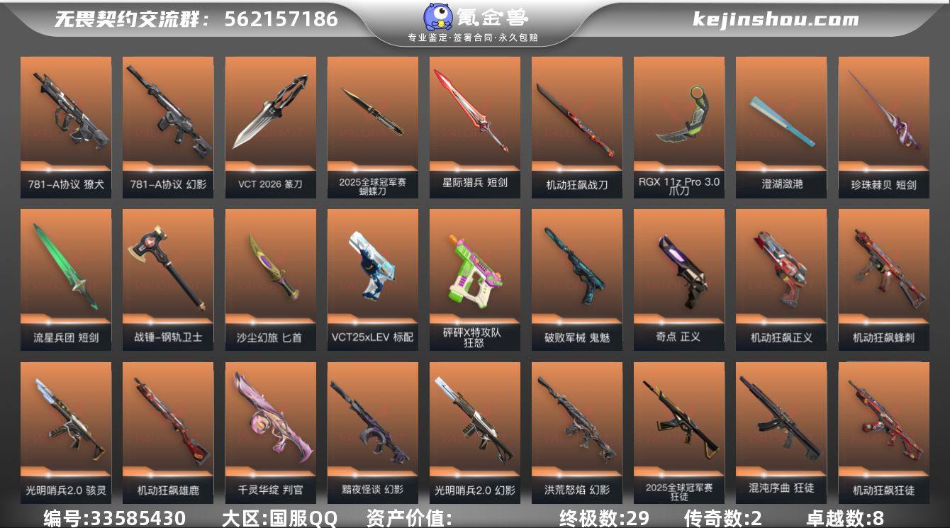 【953301】【套装】:2025全球冠军赛套装,VCT 2026 赛季套装,机动狂飙套装 【英雄】:幻棱,炼狱,维斯,暮蝶,钛狐,壹决,铁臂,捷风,雷兹,幽影,不死鸟,贤者,猎枭,蝰蛇,零,芮娜,奇乐,尚勃勒,霓虹,斯凯,夜露,星礈,K/O,海神,盖可,黑梦,钢锁 【近战武器】:近战武器-2025全球冠军赛 蝴蝶刀,近战武器-碎心裂刃,近战武器-VCT 2026 篆刀,近战武器-影钩,近战武器-RGX 11z Pro//3.0 爪刀,近战武器-澄湖潋滟,近战武器-珍珠棘贝 短剑,近战武器-流星兵团 短剑,近战武器-钢轨卫士 战锤,近战武器-机动狂飙 战刀,近战武器-沙尘幻旅 匕首,近战武器-夜刃诡镰,近战武器-星际猎兵 短剑 【狂徒】:狂徒-2025全球冠军赛,狂徒-混沌序曲,狂徒-机动狂飙,狂徒-掠影,狂徒-盖亚的复仇,狂徒-钢轨卫士,狂徒-流星兵团,狂徒-沙尘幻旅 【幻影】:幻影-黯夜怪谈,幻影-光明哨兵//2.0,幻影-洪荒怒焰,幻影-781-A协议,幻影-源能者危机001,幻影-侦察力量,幻影-珍珠棘贝,幻影-战术小伙伴 【戍卫】:戍卫-天界神兵,戍卫-钢轨卫士,戍卫-珍珠棘贝,戍卫-萌彩剪影,戍卫-战术熊与伙伴们 【獠犬】:獠犬-781-A协议,獠犬-复古浪潮,獠犬-胡桃狂想,獠犬-战术小伙伴 【...