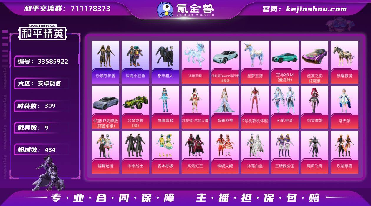【红螳螂都市粉熊背包 33粉装34特效枪9载具】 安卓V区-185266热力值-309套装-484枪皮 【9载具】 兰博SVJ绿色 合金龙骨绿色 仰望U7先锋版(阿盖尔紫) 星梦玉骢 虚妄之影(炫耀紫) 黑曜夜骑 宝马X6 M(曼岛绿) 冰绡玉鳞 保时捷Taycan 旅行版(冰晶蓝)【4稀有】 沙漠守护者 都市猎人 AWM-黄金龙骨 SCAR-L-粉色回忆【33粉装】 2号机款机体服 红螳螂 洛天依 冰霜白皇 第五大道 香水柠檬 暗夜玫瑰 绚金瑰梦 蝶舞迷情 寒光使者 蓝莓炮弹 精灵娃娃 筑梦精灵 绚丽摇曳 炙焰红王 霞光圣骑 王牌四分卫 烈焰拳霸 飓风飞鹰 紫电风暴 银龙傲海 天之羽翼 妙趣可丽 未来战士 锦绣火鲤 金丰海韵 角色-烟云彩露 角色-智耀战神 角色-光极星 幻彩电音 角色-狂花道·不知火舞 角色-绯穹魔姬 角色-异瞳寒姬【34特效枪】 SCAR-L-梦幻火箭(1级) UMP45-恐龙拽拽(2级) DP-28-扶摇飞仙(3级) SCAR-L-童趣迷兔(7级) M416-五爪金龙(6级) AKM-炫紫旋律(7级) M417-第五大道(3级) M762-甜心娃娃(7级) GROZA-香水柠檬(4级) UZI-绮梦青鸾(4级) AUG-妙趣可丽(4级) M16A4-垂柳戏鸭(4级) SLR-暗夜玫瑰(2级) AWM-焰龙焚天(3级) M249-蓝莓炮弹(3级) MG3-炙焰牛王(4级) Vector-环太平洋(1级) M416-墨龙九天(6级) Mk14-精灵梦...