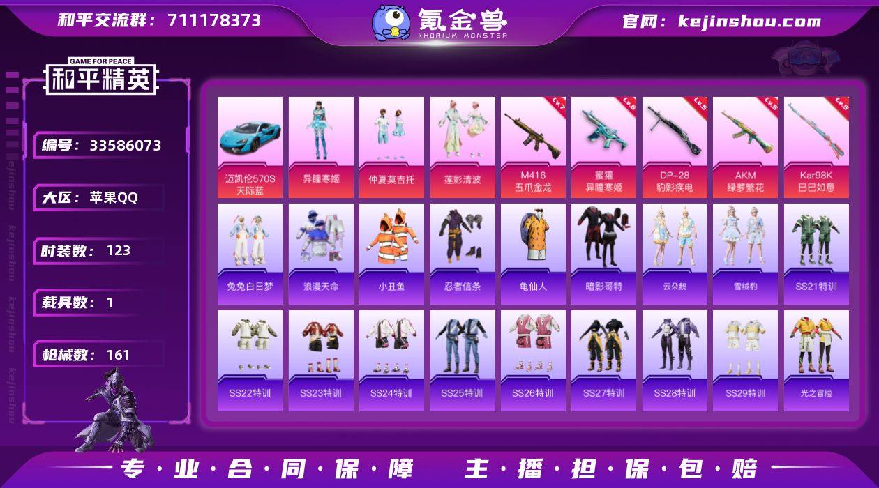 【951643】无二次TD263141苹果 手Q-3粉装-7特效枪-1载具-3粉色飞行器-51400热力值-10王牌印记-123套装-161枪皮 【热门品类】:套装-浪漫天命,套装-小丑鱼,套装-忍者信条,套装-龟仙人,套装-暗影哥特 【粉色套装】:粉装-仲夏莫吉托,粉装-莲影清波,角色-异瞳寒姬 【粉色枪皮等级】:AKM-绿萝繁花(五级),M416-五爪金龙(七级),蜜獾-异瞳寒姬(六级),UMP45-萌骑冒险(三级),Kar98K-巳巳如意(五级),Mk14-福马献瑞(三级),DP-28-豹影疾电(五级) 【粉色载具】:迈凯伦570S(天际蓝),僚机-萌兔起飞 【粉色枪皮】:AKM-绿萝繁花,M416-五爪金龙,蜜獾-异瞳寒姬,UMP45-萌骑冒险,Kar98K-巳巳如意,Mk14-福马献瑞,DP-28-豹影疾电 【粉色飞行器】:炫彩糖果飞行器,星之彼岸飞行器,拂晓神骑飞行器 【粉色降落伞】:幻影战神降落伞,童趣迷兔降落伞,星之彼岸降落伞,环太平洋降落伞,旋转彩虹降落伞,歌者泠鸢降落伞,暗夜鎏金降落伞,音爆索尼克降落伞,萌酷奶龙降落伞,精灵之光降落伞,绯穹魔姬降落伞,无垠阁降落伞,异瞳寒姬降落伞,炫彩糖果降落伞 【稀有套装】:套装-龟仙人,套装-雪国风尚,套装-炫彩糖果,套装-云朵鹅,套装-雪绒豹,套装-雨过天青,套装-红釉青花...
