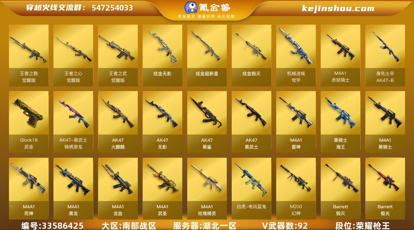 湖北一区-104V-4王者武器数-3炫金武器数 【热门武器】:QBZ03-金色蔷薇,HK417-朱雀,M200-幻神,死亡之眼,白虎-电玩蓝兔,C.A.T,M4A1-黑骑士*3,汤姆逊-烈龙*6,RPK-盘龙*6,加特林-炼狱*2,沙鹰-修罗*6 【王者炫金武器】:炫金无影,炫金超新星,炫金毁灭 【音效卡】:AK47-火麒麟音效卡,M4A1-雷神音效卡,M4A1-黑骑士音效卡,Barrett-毁灭音效卡*2,Barrett-碧霄极光音效卡 【皮肤】:雷神-暗月,雷神-能量核心*2,雷神-星空,雷神-耀金皮肤,雷神-神秘按键 皮肤,火麒麟-平天大圣,火麒麟-心动糖果,毁灭耀金皮肤,毁灭-黑大圣皮肤,毁灭-英雄计划 皮肤,黑龙-能量核心,黑龙-暗月*2,M4A1-黑龙-361,黑骑士-暗月,黑骑士-电玩青兔皮肤,无影-能量核心,战神-粉色甜心皮肤*2,战神-紫绶金章皮肤,AK47-B-常胜将军-曹操*2,AK47-B-常胜将军-刘备,AK47-B-常胜将军-孙权*2,天龙-秘银,AWM-天龙-传奇70KG,AWM-天龙-传奇白鲨,极光-能量核心,修罗-能量核心*2 【角色】:零,樱,零·纪元,战地猎狐,王者-葵-貂蝉,王者-魅影,奇洋探员,乔伊教练,修道士,云海玲珑,暗夜-X,初恋灵狐,芳心审判者,飞虎队-X,风暴女*2,虎妞,嘉年华灵狐,兰-海滩派对,兰-新年限定,0...