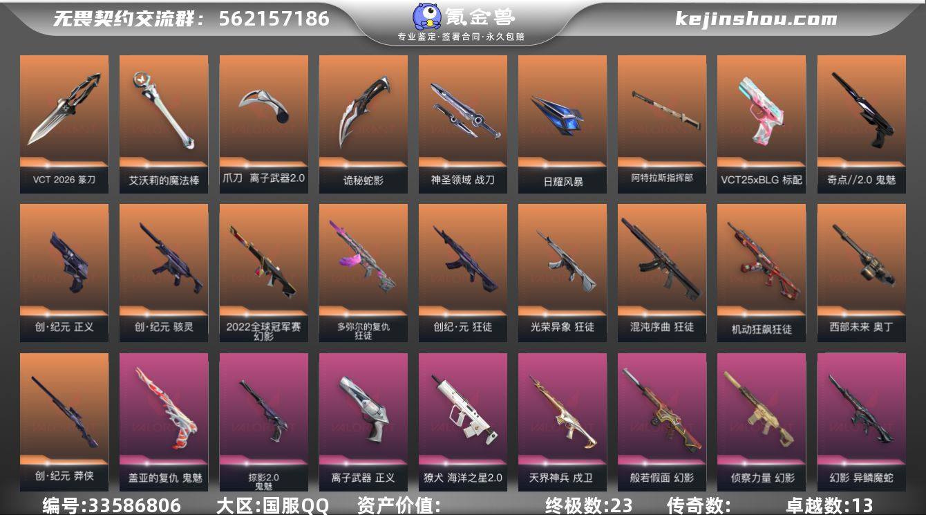 【953638】【套装】:VCT 2026 赛季套装,创·纪元套装 【英雄】:幻棱,炼狱,维斯,暮蝶,钛狐,壹决,铁臂,捷风,雷兹,幽影,不死鸟,贤者,猎枭,蝰蛇,零,芮娜,奇乐,尚勃勒,霓虹,斯凯,夜露,星礈,K/O,海神,盖可,黑梦,钢锁 【近战武器】:近战武器-碎心裂刃,近战武器-VCT 2026 篆刀,近战武器-影钩,近战武器-镭切,近战武器-艾沃莉的魔法棒,近战武器-离子武器//2.0 爪刀,近战武器-诡秘蛇影 军刀,近战武器-神圣领域 战刀,近战武器-日耀风暴 遗器,近战武器-阿特拉斯指挥部 甩棍 【狂徒】:狂徒-混沌序曲,狂徒-机动狂飙,狂徒-创·纪元,狂徒-光荣异象,狂徒-多弥尔的复仇,狂徒-盖亚的复仇,狂徒-日冕雄师,狂徒-紫阙金琅,狂徒-诡秘蛇影 【幻影】:幻影-2022全球冠军赛,幻影-般若假面,幻影-侦察力量,幻影-异鳞魔蛇,幻影-神圣领域,幻影-末日之翼 【戍卫】:戍卫-天界神兵,戍卫-月球哨兵,戍卫-折光棱晶 【獠犬】:獠犬-海洋之星//2.0,獠犬-神圣领域 【冥驹】:冥驹-起源,冥驹-星云暗涌 【飞将】:飞将-天界神兵,飞将-末日之翼 【莽侠】:莽侠-创·纪元,莽侠-诡秘蛇影,莽侠-月球哨兵 【战神】:战神-泰坦兵器,战神-神圣领域 【奥丁】:奥丁-西...