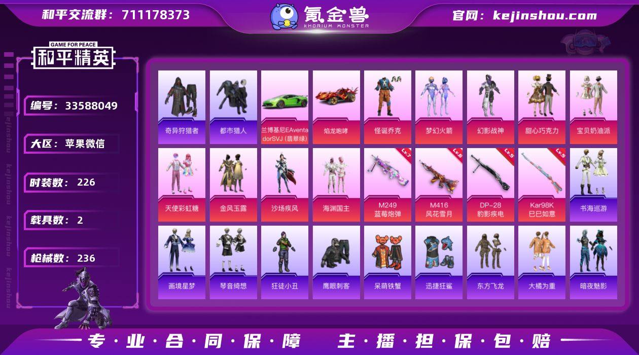 【AZH3609】苹果 微信【怪诞乔克都市巧克力三姐妹梦幻火箭幻影战神 满级蓝莓炮弹M249 酷熊背包 2载具】9粉装-7特效枪-2载具-3粉色飞行器-84254热力值-12王牌印记-226套装-236枪皮 【热门品类】:粉装-怪诞乔克,粉装-梦幻火箭,套装-浪漫天命,套装-都市猎人,套装-小丑鱼,套装-奇异狩猎者,套装-金羽特工,套装-忍者信条,套装-暗影哥特,套装-粉红小猪 【粉色套装】:粉装-幻影战神,粉装-怪诞乔克,粉装-甜心巧克力,粉装-宝贝奶油派,粉装-天使彩虹糖,粉装-梦幻火箭,粉装-金风玉露,粉装-沙场疾风,粉装-海渊国主 【粉色枪皮等级】:M416-风花雪月(六级),UMP45-萌骑冒险(五级),AKS-74U-森灵之息(四级),Kar98K-巳巳如意(五级),Mk14-福马献瑞(五级),M249-蓝莓炮弹(七级),DP-28-豹影疾电(五级) 【粉色载具】:兰博基尼Aventador SVJ(翡翠绿),焰龙咆哮 【粉色枪皮】:M416-风花雪月,UMP45-萌骑冒险,AKS-74U-森灵之息,Kar98K-巳巳如意,Mk14-福马献瑞,M249-蓝莓炮弹,DP-28-豹影疾电 【粉色飞行器】:梦幻火箭飞行器,古堡领主飞行器,潮汐统领飞行器 【粉色降落伞】:甜心宝贝降落伞,PEL轰鸣竞梦者降落伞,古堡领主降落伞,四圣焕新降落伞,心之恋语降落伞,...