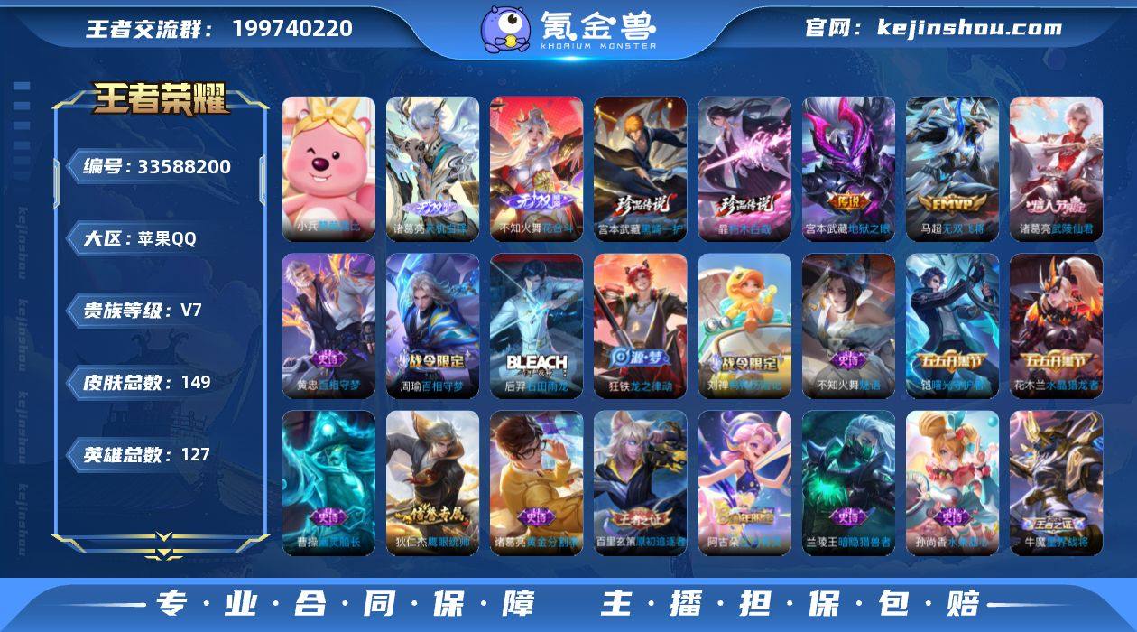 2w暃·金标1.19w诸葛亮·金标1.1w阿轲·打野44段·花合斗·天机白泽·黑崎一护·朽木白哉·武陵仙君·无二次包过】w24147-苹果Q-127英雄-149皮肤-17王者印记-230铭文-贵族积分2w【贵族7】【2无双·2珍品·4传说·11按键·266幸运值】【因赛季更新游戏段付以上号为准!】 【英雄全皮】:孙权全皮,敖隐全皮 【无双皮肤】:诸葛亮天机白泽,不知火舞花合斗 【珍品传说】:宫本武藏黑崎一护,暃朽木白哉 【传说皮肤】:桑启鸣野蒿,马超无双飞将,诸葛亮武陵仙君,宫本武藏地狱之眼 【限定皮肤】:姜子牙天穹之誓,狄仁杰阴阳师,赵云皇家上将,高渐离玩趣恶龙,扁鹊奇幻香踪,狄仁杰魔术师,项羽海滩派对,兰陵王金庭之子,李元芳云中旅人,杨玉环寅虎心曲,杨戬潮玩骑兵,雅典娜黎明之约,鬼谷子五谷丰年,诸葛亮武陵仙君,百里玄策原初追逐者,梦奇顽趣,沈梦溪大漠名商,裴擒虎擒涛扼浪,鲁班大师探海日志,桑启海盐诗旅,阿古朵江河有灵,张良古海寻踪,蒙恬荣光圣徽,妲己灵卜魔法,鬼谷子天穹祈灯,沈梦溪龙舞盛年,鲁班七号蔬乡物语,李元芳蔬乡物语,刘邦剑破天穹,周瑜熔金海岸,不知火舞花合斗 【年限皮肤】:杨玉环寅虎心曲 【赛季限定】:兰陵王金庭之子,沈梦溪大漠名商,李元芳...