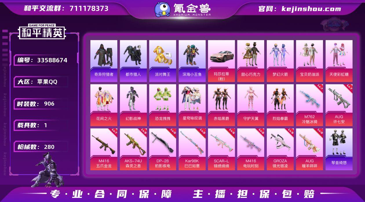 【特价出售】苹果Q-8稀有1载具11粉装14特效枪21热门242套装280枪皮 95745热力值 26印记 历史无敌战神 【8稀有】 奇异狩猎者 M416-黄金龙骨 AWM-黄金龙骨 AKM-百万伏特 都市猎人 浪漫天命 派对舞王 派对舞王(金靴子) 【1载具】 玛莎拉蒂粉色 【11粉装】 梦幻火箭 宝贝奶油派 天使彩虹糖 甜心巧克力 星穹咏叹调 守护天翼 幻影战神 花间之火 烈焰拳霸 赤焰黑爵 恐龙拽拽 【14特效枪】 M416-五爪金龙 (7级) SCAR-L-锦绣绵绵 (5级) M416-电玩时刻 (5级) AKS-74U-森灵之息 (5级) Kar98K-巳巳如意 (5级) DP-28-豹影疾电 (5级) AUG-暖羊咩咩 (5级) AUG-许七安 (7级) GROZA-镜光银凌 (5级) M762-冷魅冰骑 (7级) 信号枪-金乌曜日 (2级) Mk14-福马献瑞 (5级) UMP45-萌骑冒险 (3级) 燃烧瓶-天降桃花 (6级) 【21热门】 Mark.06 龟仙人 暗夜之虎 雪山精英 鹰眼刺客 激萌罗小黑 暗夜之虎 深海小丑鱼 金羽特工 团圆交子 瑞龙福将 豚鼠丹丹 狂沙舞者 漫步者 梦之呓语 韶华初心 破蛋小黄鸡 极速红龙 军刀雅典娜 M762-奇异狩猎者 M762-瑞龙福将 【2飞行器】 龙翔九天飞行器 冷魅冰骑飞行器 【7头盔】 甜心宝贝头盔 百万伏特头盔 幻影战神头盔 金羽特工头盔 甜蜜誓约头盔 花间之火头盔 夏日绵绵...