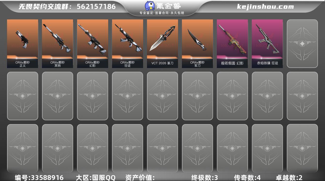 【套装】:VCT 2026 赛季套装,ORA x 颗秒套装 【英雄】:炼狱,暮蝶,钛狐,捷风,不死鸟,贤者,猎枭,蝰蛇,零,芮娜,尚勃勒,霓虹,盖可 【近战武器】:近战武器-蒙太奇 战斧,近战武器-VCT 2026 篆刀,近战武器-ORA x 颗秒 军刀 【狂徒】:狂徒-ORA x 颗秒,狂徒-赤焰铁骥 【幻影】:幻影-ORA x 颗秒,幻影-般若假面,幻影-蒙太奇 【冥驹】:冥驹-ORA x 颗秒 【战神】:战神-蒙太奇 【骇灵】:骇灵-蒙太奇 【正义】:正义-ORA x 颗秒 【狂怒】:狂怒-蒙太奇 【卡面】:南瓜盛典 卡面,维斯工牌 卡面,正义的化身 卡面,无畏契约GO!第一卷:零 卡面,光导纤维 卡面,代号红色 卡面,冰淇淋店 卡面,新兵报到 卡面,友军火力 卡面,V契约 卡面,无畏契约 卡面 【喷漆】:控场勿近 喷漆,审判之爪 喷漆,买装还是存钱 喷漆,真相只有一个 喷漆,胜利属于无畏契约 喷漆,GLHF 喷漆,无畏契约 喷漆 【挂饰】:第九季//第三幕 纪念币 挂饰,鱼骨头 挂饰,天外飞客 挂饰,无畏契约 纪念币 挂饰
