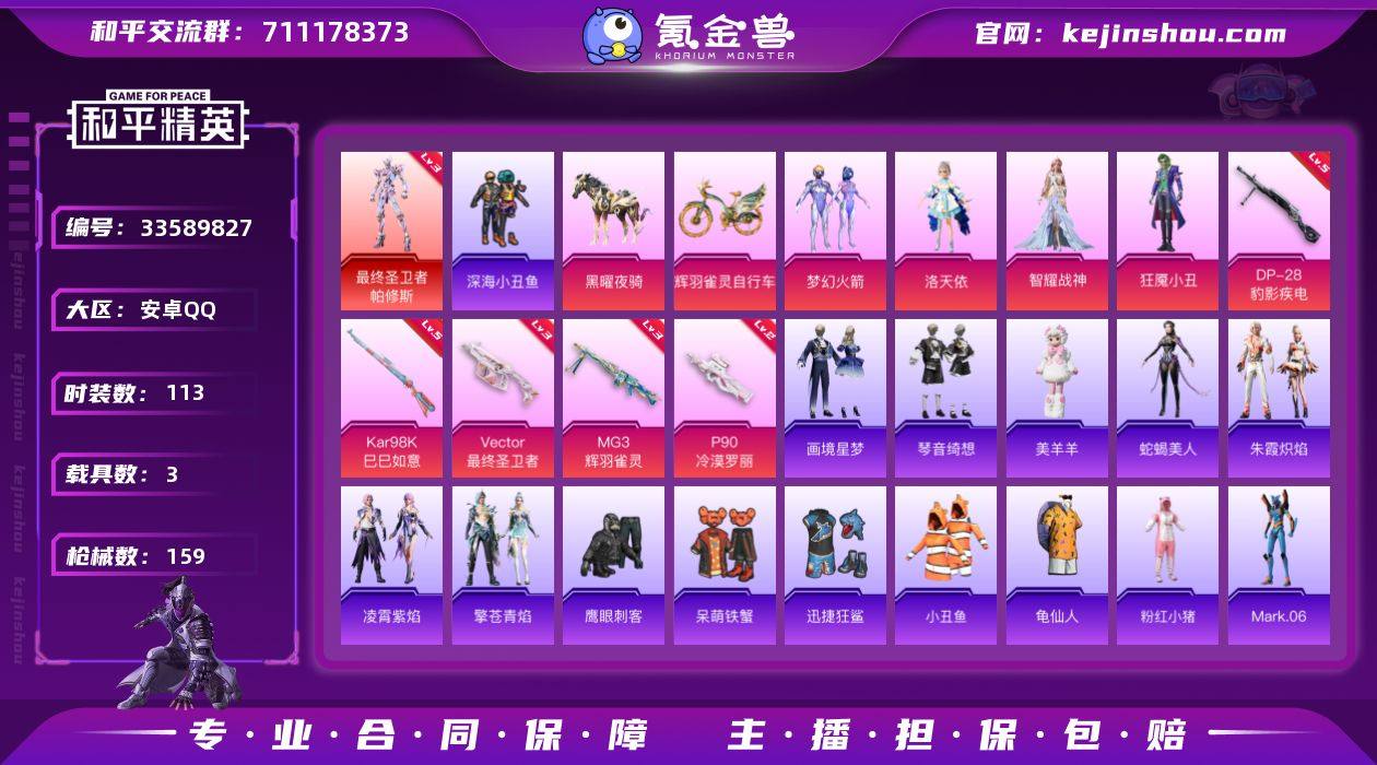 安卓 手Q-1神装-4粉装-7特效枪-3载具-6粉色飞行器-51306热力值-12王牌印记-113套装-159枪皮 【红色神装等级】:最终圣卫者-帕修斯(三级) 【红色角色神装】:最终圣卫者-帕修斯 【热门品类】:粉装-梦幻火箭,套装-深海小丑鱼,套装-小丑鱼,套装-龟仙人,套装-粉红小猪,角色-Mark.06 【粉色套装】:粉装-梦幻火箭,角色-洛天依,角色-智耀战神,角色-狂魇小丑 【粉色枪皮等级】:UMP45-萌骑冒险(二级),Vector-最终圣卫者(三级),P90-冷漠罗丽(二级),Kar98K-巳巳如意(五级),Mk14-福马献瑞(五级),DP-28-豹影疾电(五级),MG3-辉羽雀灵(三级) 【粉色载具】:黑曜夜骑,九霄玄鹿,辉羽雀灵自行车 【粉色枪皮】:UMP45-萌骑冒险,Vector-最终圣卫者,P90-冷漠罗丽,Kar98K-巳巳如意,Mk14-福马献瑞,DP-28-豹影疾电,MG3-辉羽雀灵 【粉色飞行器】:深渊漩涡飞行器,雀灵庇佑飞行器,时光之誓飞行器,终晖之翼飞行器,灵猫魔法师飞行器,云梦轻舟飞行器 【粉色降落伞】:第五大道降落伞,镜域双华降落伞,创世·救赎降落伞,宇宙意志降落伞,月影灵韵降落伞,辉羽雀灵降落伞,幻彩电音降落伞,时光之吻降落伞,最终圣卫者降落伞,冷漠罗丽降落伞,荧海星豚降落伞,镜花水月降落伞...