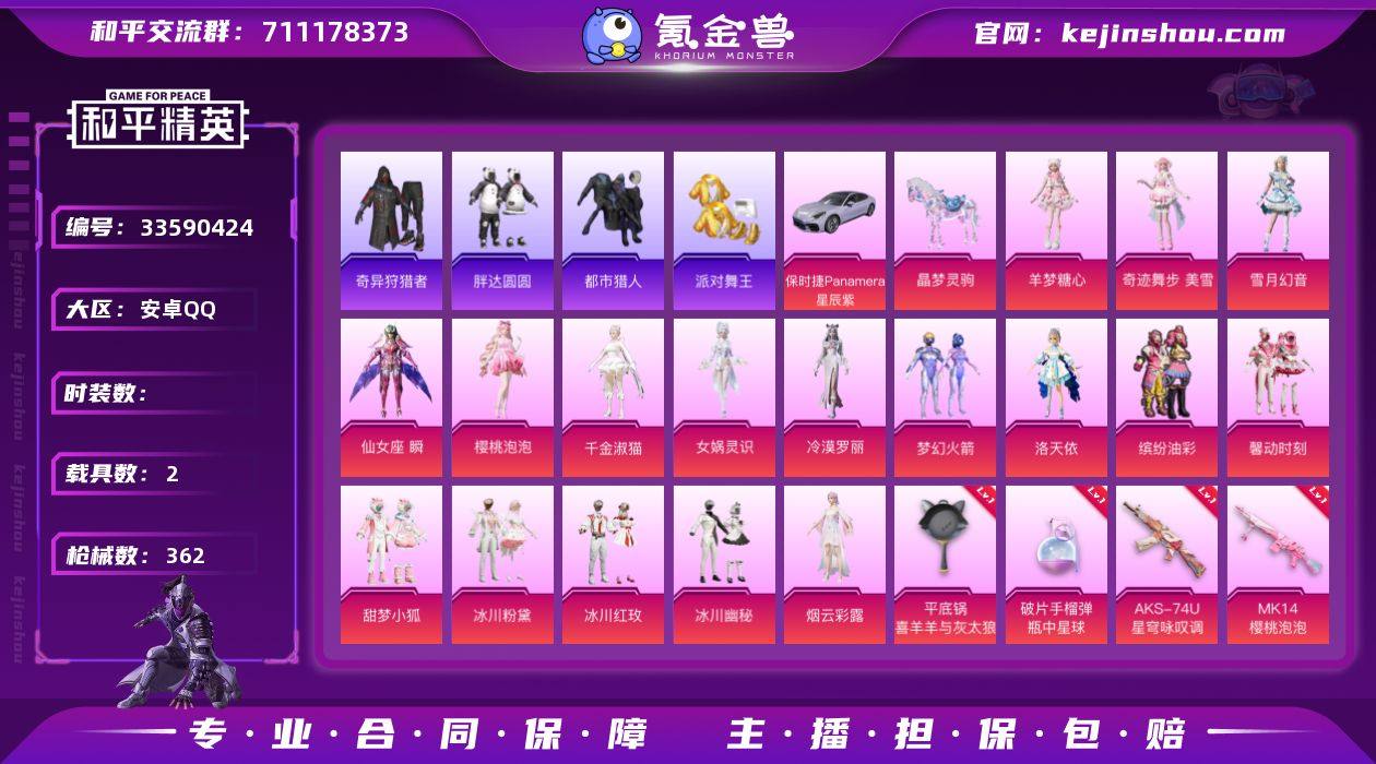 【小姐姐号!都市 金鞋 小狐 猪妹 马卡龙 胖达 哥特 满地铁天赋】c30204-【可二次】【因赛季更新游戏段付以上号为准!】 安卓Q-6稀有2载具18粉装16特效枪23热门275套装362枪皮 22印记 历史传奇王牌26星 【6稀有】 奇异狩猎者 巡查衣 都市猎人 浪漫天命 派对舞王 派对舞王(金靴子) 【2载具】 保时捷Panamera(星辰紫) 晶梦灵驹 【18粉装】 梦幻火箭 女娲灵识 奇迹舞步美雪 仙女座瞬 千金淑猫 洛天依 月中灵 雪月幻音 烟云彩露 樱桃泡泡 冷漠罗丽 羊梦糖心 缤纷油彩 冰川幽秘 甜梦小狐 馨动时刻 冰川粉黛 冰川红玫 【16特效枪】 SCAR-L-锦绣绵绵 (5级) M416-电玩时刻 (5级) AKS-74U-星穹咏叹调 (4级) Kar98K-巳巳如意 (5级) DP-28-千金淑猫 (1级) DP-28-豹影疾电 (5级) DP-28-罗征 (5级) Mk14-樱桃泡泡 (4级) Mk14-甜梦熊击 (5级) M416-风花雪月 (7级) Mk14-福马献瑞 (5级) AA12-G-萌骑幻想 (2级) PKM-萌骑夺宝 (2级) ACE32-萌骑漫游 (2级) 平底锅-喜羊羊与灰太狼 (5级) 破片手榴弹-瓶中星球 (6级) 【23热门】 Mark.06 龟仙人 浪漫假日 雪山精英 软软马卡龙 晶辉守护 呆萌铁蟹 鹰眼刺客 兔兔白日梦 浪漫波比 胖达圆圆 暗夜契约 怪笑疯兔 暗影哥特 团圆交子 瑞龙福将 狂沙...