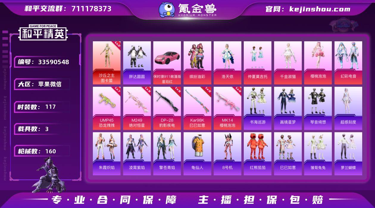 【AZH3669】苹果 微信【二级图卡盟 猪脸千金淑猫樱桃泡泡红熊茄茄 满级恐龙拽拽UMP45 3载具】1神装-6粉装-7特效枪-3载具-3粉色飞行器-58209热力值-8王牌印记-117套装-160枪皮 【红色神装等级】:沙丘之主-图卡盟(二级) 【红色角色神装】:沙丘之主-图卡盟 【热门品类】:粉装-缤纷油彩,套装-胖达圆圆,套装-龟仙人,角色-8号机,套装-红熊茄茄 【粉色套装】:粉装-缤纷油彩,角色-洛天依,粉装-仲夏莫吉托,角色-千金淑猫,角色-樱桃泡泡,粉装-幻彩电音 【粉色枪皮等级】:AKM-暮色玫影(三级),UMP45-恐龙拽拽(七级),Kar98K-巳巳如意(五级),Mk14-樱桃泡泡(四级),Mk14-福马献瑞(五级),M249-绝对恒星(六级),DP-28-豹影疾电(五级) 【粉色载具】:法拉利Roma(碧空蓝),保时捷911 敞篷版(星珀红),暮色幽蹄 【粉色枪皮】:AKM-暮色玫影,UMP45-恐龙拽拽,Kar98K-巳巳如意,Mk14-樱桃泡泡,Mk14-福马献瑞,M249-绝对恒星,DP-28-豹影疾电 【粉色飞行器】:香车宝马飞行器,炫彩糖果飞行器,暮色之舞飞行器 【粉色降落伞】:春暖花开降落伞,洛神天依降落伞,彩虹甜喵降落伞,旋转彩虹降落伞,畅跳缤纷降落伞,未来歌姬降落伞,星梦奇缘降落伞,千金淑猫降落伞,樱桃泡泡...