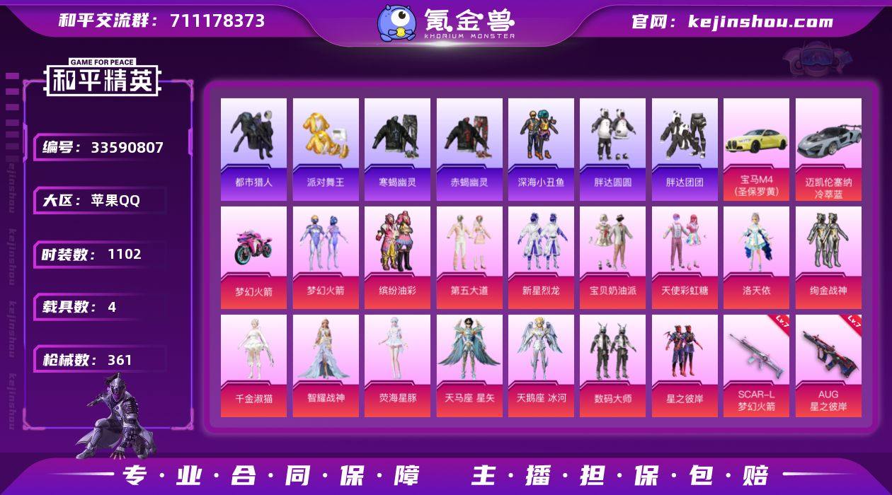 【特价出售】QQ钱包无法注销苹果Q-9稀有3载具16粉装12特效枪36热门298套装361枪皮 125511热力值 19印记 历史无敌战神 【9稀有】 赤蝎幽灵 寒蝎幽灵 M416-黄金龙骨 AWM-黄金龙骨 AKM-缤纷海域 都市猎人 浪漫天命 派对舞王 派对舞王(金靴子) 【3载具】 宝马M4(圣保罗黄) 迈凯伦塞纳(冷萃蓝) 双人摩托梦幻火箭 【16粉装】 梦幻火箭 天马座星矢 天鹅座冰河 宝贝奶油派 天使彩虹糖 小舞雪昙 千金淑猫 洛天依 荧海星豚 智耀战神 缤纷油彩 数码大师 第五大道 新星烈龙 绚金战神 星之彼岸 【12特效枪】 SCAR-L-梦幻火箭 (7级) SCAR-L-锦绣绵绵 (5级) M416-电玩时刻 (5级) Kar98K-巳巳如意 (5级) M762-鬼刀 (6级) DP-28-千金淑猫 (5级) DP-28-豹影疾电 (5级) AMR-智耀战神 (5级) AUG-星之彼岸 (7级) Mk14-福马献瑞 (5级) UMP45-萌骑冒险 (2级) Vector-环太平洋 (7级) 【36热门】 8号机 Mark.06 小丑鱼 龟仙人 萌神柯基 浪漫假日 红熊茄茄 仓鼠灰灰 潮萌小黄鸭 小狗蛇点点 鹰眼刺客 星兔领航员 兔兔白日梦 激萌罗小黑 深海小丑鱼 浪漫波比 金羽特工 童话森林 胖达圆圆 胖达团团 LGD追光队服 DKG战队服 暗影哥特 醒狮腾龙 团圆交子 瑞龙福将 纯白誓言 狂沙舞者 漫步者 蓝甜马卡龙 娴静...