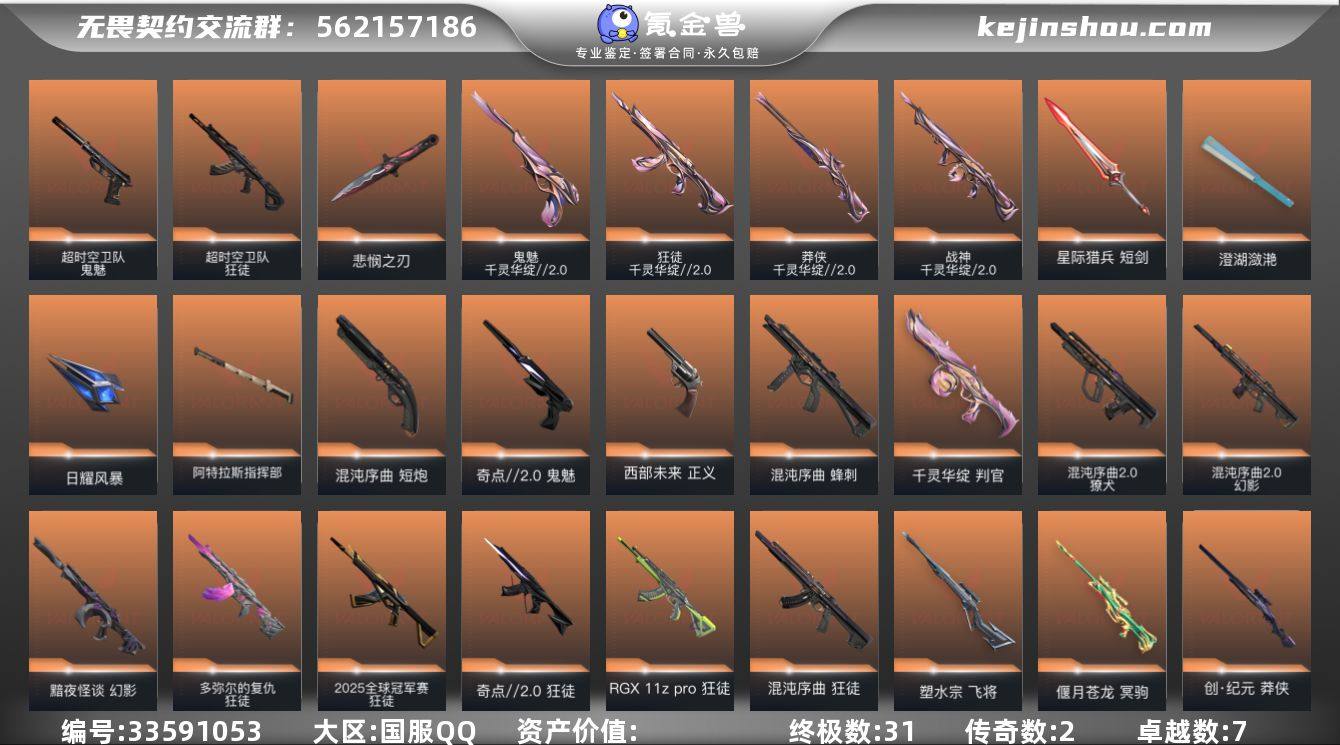 【953744】【套装】:无畏契约季前邀请赛套装,千灵华绽//2.0套装 【英雄】:幻棱,炼狱,维斯,暮蝶,钛狐,壹决,铁臂,捷风,雷兹,幽影,不死鸟,贤者,猎枭,蝰蛇,零,芮娜,奇乐,尚勃勒,霓虹,斯凯,夜露,星礈,K/O,海神,盖可,黑梦,钢锁 【近战武器】:近战武器-碎心裂刃,近战武器-无畏契约季前邀请赛 悲悯之刃,近战武器-流风回雪,近战武器-魔术火花,近战武器-剥皮小刀,近战武器-紫金爪刀,近战武器-澄湖潋滟,近战武器-日耀风暴 遗器,近战武器-阿特拉斯指挥部 甩棍,近战武器-星际猎兵 短剑,近战武器-魔术火花 【狂徒】:狂徒-2025全球冠军赛,狂徒-混沌序曲,狂徒-奇点//2.0,狂徒-RGX 11z Pro,狂徒-多弥尔的复仇,狂徒-千灵华绽//2.0,狂徒-超时空卫队,狂徒-盖亚的复仇 【幻影】:幻影-黯夜怪谈,幻影-混沌序曲//2.0,幻影-侦察力量 【戍卫】:戍卫-紫阙金琅 【獠犬】:獠犬-混沌序曲//2.0 【冥驹】:冥驹-偃月苍龙,冥驹-起源 【飞将】:飞将-塑水宗 【莽侠】:莽侠-创·纪元,莽侠-千灵华绽//2.0 【战神】:战神-千灵华绽//2.0,战神-沙场老兵 【奥丁】:奥丁-巨神铁甲 【判官】:判官-千灵华绽 【雄鹿】:雄鹿-紫阙金琅//2.0 【骇灵】:骇灵-侦察...