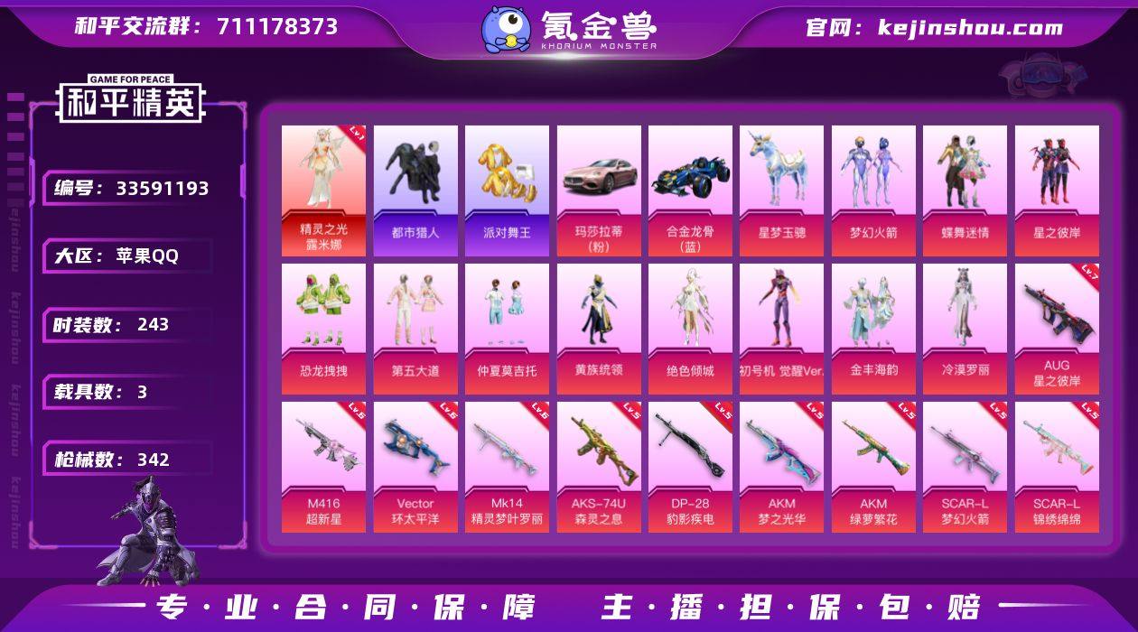 苹果【极品神装号/17王牌印记/精灵之光-露米娜(一级)/M416-超新星(六级)/梦幻火箭/初号机 觉醒Ver/都市猎人/派对舞王/小丑鱼/暗影哥特/粉螳螂/蓝螳螂/百万伏特背包/1神装-11粉装-21特效枪-3载具-14粉色飞行器】 手Q--117937热力值-17王牌印记-243套装-342枪皮 【红色神装等级】:精灵之光-露米娜(一级) 【红色角色神装】:精灵之光-露米娜 【热门品类】:粉装-梦幻火箭,套装-浪漫天命,套装-都市猎人,套装-派对舞王,套装-小丑鱼,角色-军刀雅典娜,套装-忍者信条,角色-2P战斗服款,套装-龟仙人,套装-潮萌小黄鸭,套装-暗影哥特,角色-8号机,角色-Mark.06,熔岩游骑兵连帽夹克 【粉色套装】:粉装-蝶舞迷情,粉装-梦幻火箭,粉装-星之彼岸,粉装-恐龙拽拽,粉装-第五大道,粉装-仲夏莫吉托,粉装-黄族统领,角色-绝色倾城,角色-初号机 觉醒Ver.,粉装-金丰海韵,角色-冷漠罗丽 【粉色枪皮等级】:AKM-梦之光华(五级),AKM-绿萝繁花(五级),SCAR-L-梦幻火箭(五级),SCAR-L-锦绣绵绵(五级),M416-超新星(六级),M416-电玩时刻(五级),GROZA-精灵之光(三级),GROZA-镜光银凌(四级),AUG-星之彼岸(七级),UMP45-量子极限(五级),Vector-环太平洋(六级),AKS-74U-森灵之息(五...