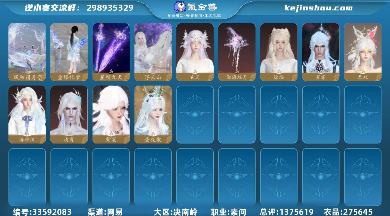 区服】 江山如画 【充值称号】 把酒临风 【已用天赏石】 17 【天赏发型】 惊焰, 玄芝, 海神泪, 星雾, 无双, 清宵, 昼夜歌, 紫宸, 浮云山 【天赏祥瑞】 眠鲤宿月亭 【天赏外观】 蝴蝶武器, 星辰武器, 水母武器, 霜尾胧烟·玉狐梦漪, 重蝶化梦 【副本外观】 白夜拂雪*1 【配饰】 纤尾拂梦, 枕梦同归, 夜阑玄翼 【商城外观】 舞乐火霓, 墨喧雪绒, 雪庭问宋, 逸夏浮澜, 音律织光, 碎玉怜姻, 丹青故筠, 绯月狼舞, 皓雪冰临, 裁花信, 曦凤嘉煌, 飞叶若依, 枫华九霄, 甜宙漫游, 菲菲甜心, 海盐甜梦, 璇霄织月, 夜雪闻梅, 金缕漠歌, 赤乌驰阙, 粉蔷曳风, 雾都往事, 蕉雨夜澜, 苍蓝微风, 烹椒听雀, 青羽惊梦, 幽蝶魅影, 幻音星缘, 云梦萤星, 焕曜旋煌, 紫霄云旗, 司命秋罗, 海月漫歌, 海镜霜繁, 修月碧海, 血宴风华, 鸿福昭运, 灵娲泽生, 珊枝琢浪, 朝歌旧梦, 天籁闻歌, 晶梦绮舞, 灵珠饮月, 跃动心芒, 朔雪从风, 逍遥千风, 蝎影度月, 灼金喵影, 云腾游雾, 幽蝶眠花, 灵语星彩, 绒粉美梦, 凤亭疏香, 悬蛛结心, 芳汀花影, 云汉逢夕, 难负君思, 白露惑心, 鳞纱幻海, 鳞骨逢幽, 白尘游昼, 星宫遐音, 青林雀舞, 紫微御宵, 衣香鬓影, 混天焚莲, 曦照东晖, 赤狐魅语, 圣月澄空, 醉墨狂歌, 天纵...