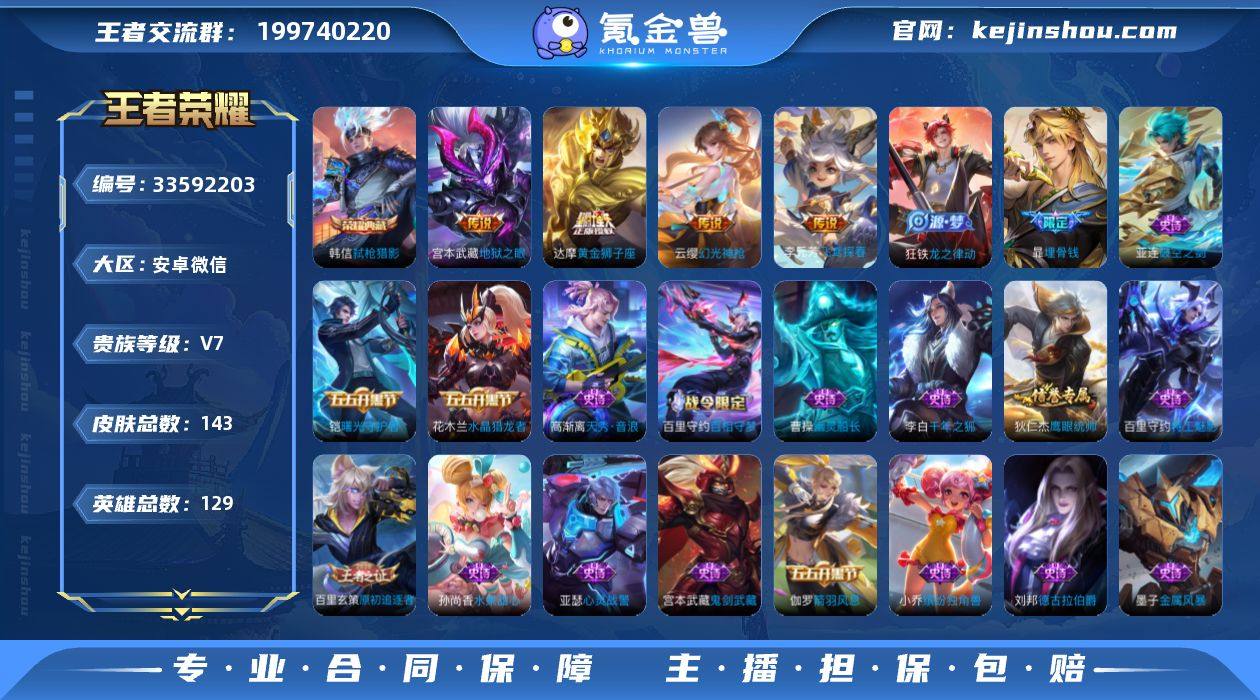 传说 10传说 129英雄 143皮肤 可二次 可修改实名 女号 【英雄全皮】敖隐全皮,孙权全皮,蚩奼全皮,影全皮,大禹全皮 【稀有英雄】敖隐(小龙人),大司命,嬴政(始皇帝),韩信(韩跳跳),夏洛特(夏师傅),艾琳,橘右京(橘子),娜可露露(鸟人),不知火舞,赵云,金蝉(唐僧),戈娅 【荣耀水晶】弑枪猎影(韩信典藏) 【珍品传说】江户川柯南,怪盗基德 【传说皮】神骥·赴朔漠,幻光神枪,踏浪归,黄金狮子座,地狱之眼,末日机甲-孙尚香(绿蚂蚱),飞鸢探春,澜逐花归海 【珍宝阁皮】女武神 【赛季/战令皮】噬灭天穹(s37),天穹之誓(s36),御旌(s15),御銮(s16),原初探秘者(s21),落雪兰心 【史诗皮】百晓客,海之女神,破空之剑,百相守梦-百里守约,茶境仙,埋骨钱,光弋星穹,天穹守望者,线条小狗-周瑜,九幽镇关,线条小狗-小乔,龙之律动,紫霞仙子,特工魅影,千年之狐,冰冠公主,偶像歌手,水果甜心,功夫厨神,德古拉伯爵,幽灵船长,鬼剑武藏,心灵战警,缤纷独角兽,逐浪之夏,水晶猎龙者,曙光守护者,箭羽风息,金属风暴,原初追逐者,圣诞恋歌,鹰眼统帅,暗夜贵公子,魅力维加斯,天秀·音浪 【限定皮】愿照·九州拓(澜年限),逐霄战戟,鸣野蒿,李小龙 【普通皮】舞狮寰,赤刃凌霄,铁骨偃魂,敬我三分,百相守梦-老夫子,雾都夜雨,谧流熔炉...