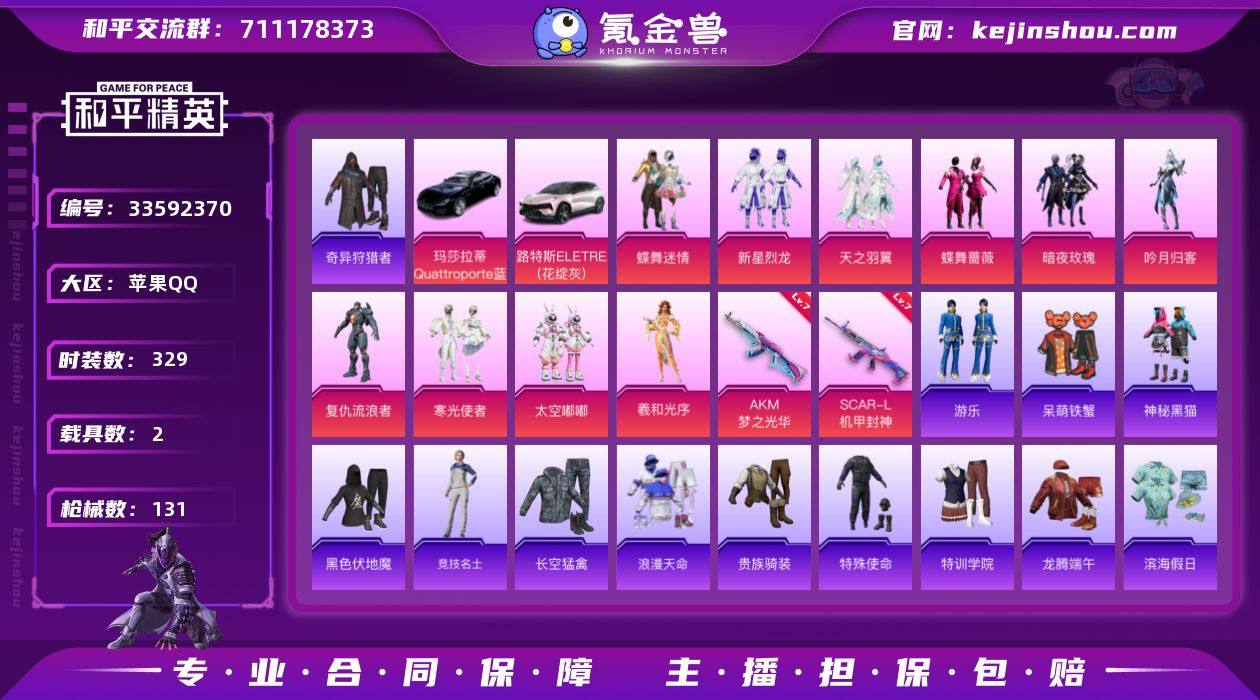 实名: 可修改 时装数: 329 载具数: 2 枪械数: 131 战备数: 2 热门装扮: 奇异狩猎者,蝶舞迷情,呆萌铁蟹,新星烈龙,蝶舞蔷薇,暗夜玫瑰,吟月归客,天之羽翼,寒光使者,复仇流浪者,太空嘟嘟,神秘黑猫,羲和光序 载具: 路特斯ELETRE(花绽灰),玛莎拉蒂Quattroporte(夜幕蓝) 稀有枪皮: AKM梦之光华,SCAR-L机甲封神 亮点: 【优质装备】:暗影哥特(红眼罩),奇异狩猎者,新星烈龙(小白龙),七级SCAR-L-机甲封神,七级AKM-梦之光华
