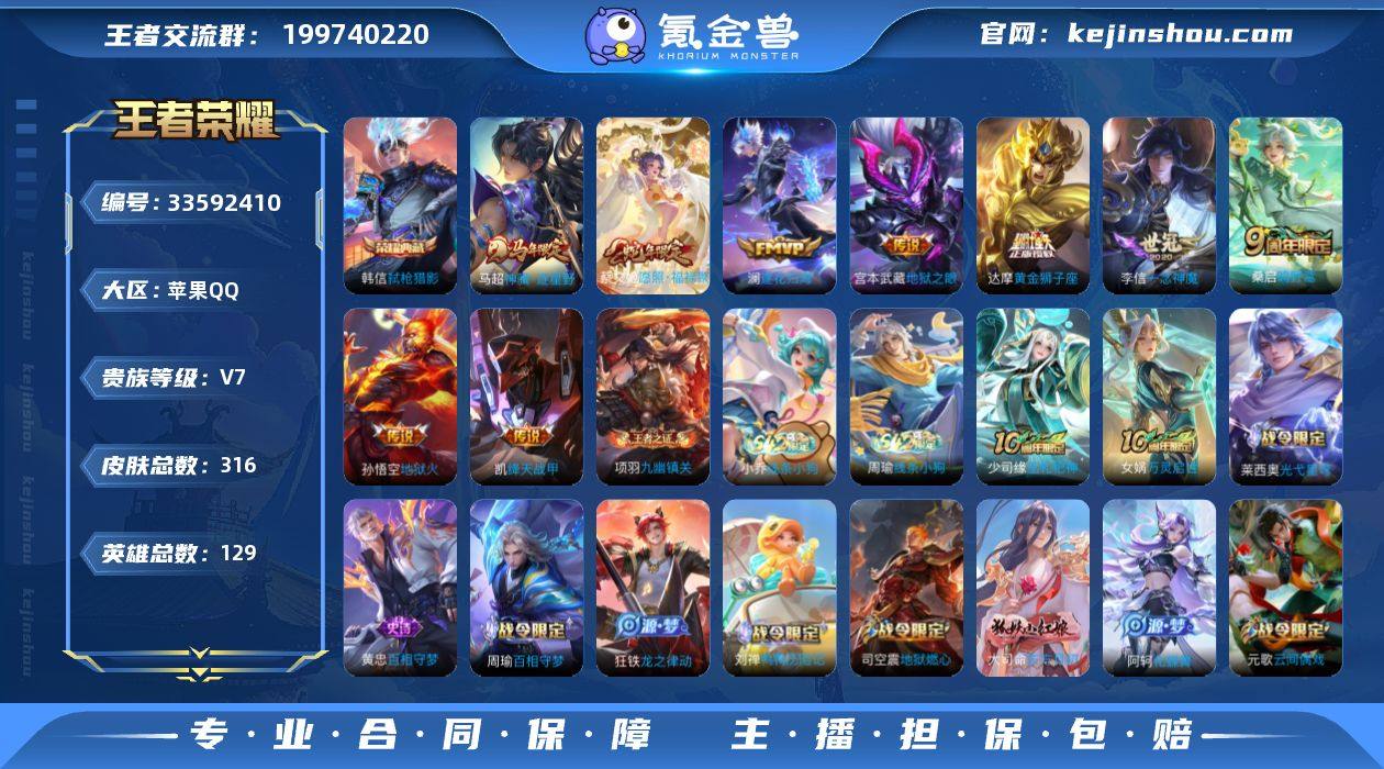 实名: 可修改 贵族等级: V7 英雄数: 129 皮肤数: 316 荣耀水晶: 弑枪猎影 传说皮: 黄金狮子座,绛天战甲,一念神魔,地狱火,地狱之眼,澜逐花归海,神骥·逐星野 限定皮: 李小龙,五谷丰年,鸣野蒿,逐霄战戟,愿照·福禄聚