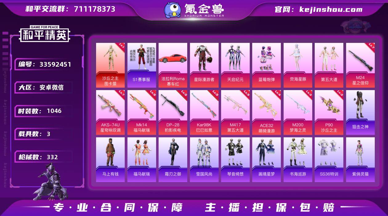实名: 可修改 时装数: 1046 载具数: 3 枪械数: 332 战备数: 3 神级装扮: 沙丘之主-图卡盟 热门装扮: 星际漫游者,天启纪元,梦魇先生,万圣娃娃,爱崽白熊,恒星战甲,东方飞龙,蓝莓炮弹,S1赛事上衣,大橘为重,奇迹天团,第五大道,荧海星豚 载具: 法拉利Roma(赛车红) 稀有枪皮: 黄金龙骨Mini14,M24星之信仰,M417第五大道,P90沙丘之主,M200梦海之灵,Kar98K-巳巳如意,AKS-74U-星穹咏叹调,DP-28-豹影疾电,MK14-福马献瑞,ACE32-萌骑漫游 亮点: 【优质装备】:沙丘之主-图卡盟(黄金木乃伊),一级沙丘之主-图卡盟,太空漫步(星星裤子),七级M24-星之信仰,七级AKS-74U-星穹咏叹调