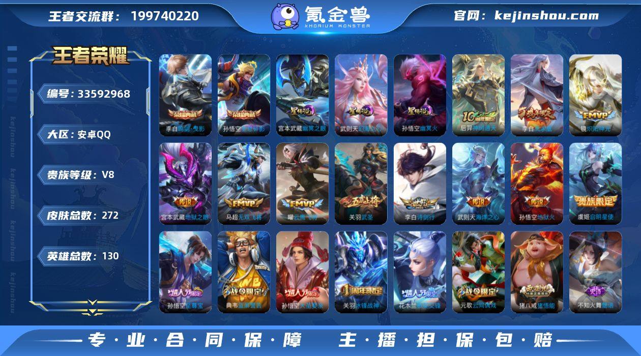 V8 3典藏 1珍品 13传说 3星元 272皮肤 130英雄 【3水晶】李白-鸣剑·曳影,孙悟空-全息碎影【1珍品传说】【13传说】李白-诗剑行,马超-无双飞将,宫本武藏-地狱之眼,关羽-武圣,镜-炽阳神光,李白-凤求凰,孙悟空-地狱火,武则天-海洋之心,虞姬-启明星使,曜-云鹰飞将,后羿-神树通天【3星元】武则天-幻海之心,孙悟空-幽冥火,宫本武藏-幽冥之眼【75史诗】元歌-无心,鬼谷子-五谷丰年,赵云-未来纪元,钟无艳-超时空战士,狂铁-电玩高手,澜-赏金猎手,阿轲-暗夜猫娘,阿轲-节奏热浪,安琪拉-心灵骇客,安琪拉-时之奇旅,白起-星夜王子,百里玄策-原初追逐者,不知火舞-魅语,蔡文姬-舞动绿茵,曹操-幽灵船长,嫦娥-拒霜思,程咬金-功夫厨神,妲己-女仆咖啡,妲己-魅力维加斯,大乔-猫狗日记,狄仁杰-魔术师,狄仁杰-鹰眼统帅,典韦-蓝屏警告,貂蝉-圣诞恋歌,干将莫邪-真爱魔法,宫本武藏-鬼剑武藏,关羽-冰锋战神,花木兰-水晶猎龙者,花木兰-默契交锋,黄忠-火炮绅士,兰陵王-暗隐猎兽者,兰陵王-驯魔猎人,李白-千年之狐,李元芳-逐浪之夏,李元芳-银河之约,廉颇-地狱岩魂,刘邦-德古拉伯爵,刘禅-绅士熊喵,刘禅-天才门将,露娜-紫霞仙子,鲁班七号-电玩小子,鲁班七号-狮舞东方,吕布-圣诞狂欢,吕布-末日机甲,墨子-金属风暴,...