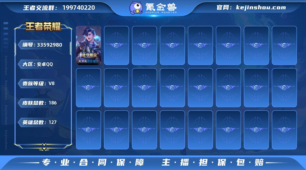 安卓Q-V8-至尊星耀II段位-127英雄-186皮肤-2典藏皮肤-1无双-22传说-60史诗