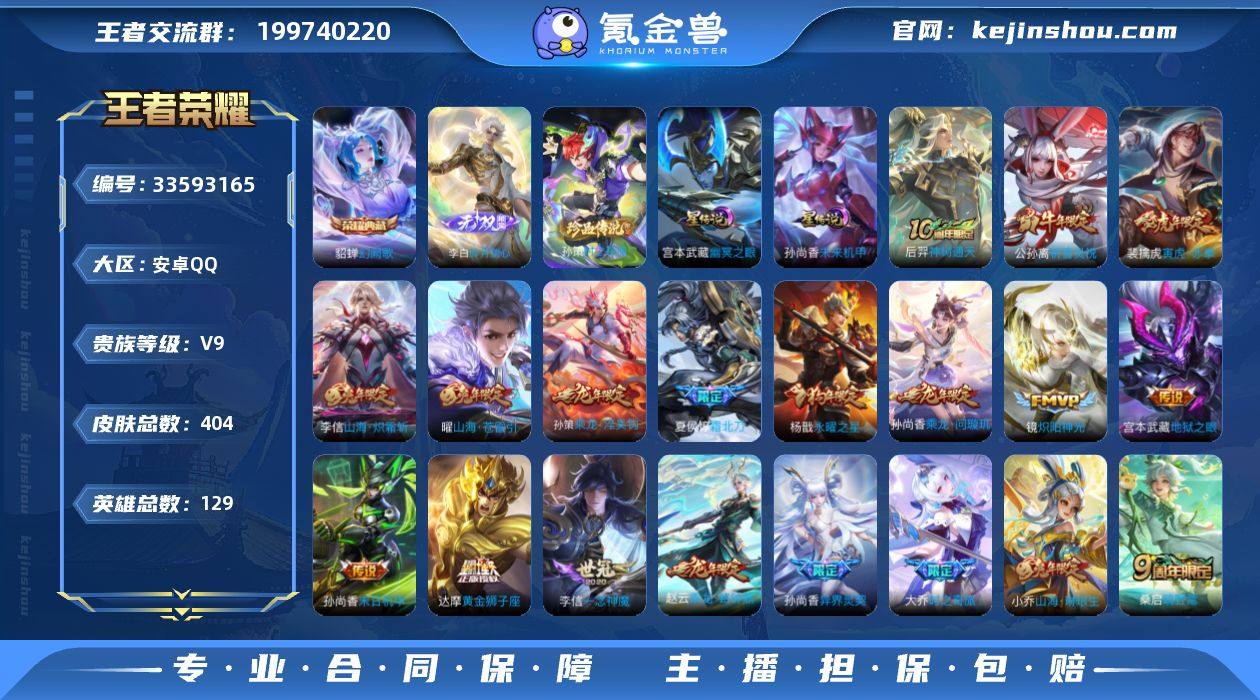 V9 1典藏 1无双 1珍品 41传说 2星元 404皮肤 129英雄 【1水晶】貂蝉-幻阙歌【1无双】李白-碎月剑心【1珍品传说】孙策-时之奇旅【41传说】项羽-无限倾心,虞姬-无限倾心,曜-山海·苍雷引,小乔-山海·琳琅生,孙悟空-齐天大圣,李信-山海·炽霜斩,狄仁杰-神器·狴犴令,百里守约-碎云,孙策-挚爱之约,达摩-黄金狮子座,狄仁杰-超时空战士,貂蝉-仲夏夜之梦,干将莫邪-久胜战神,公孙离-祈雪灵祝,宫本武藏-地狱之眼,镜-炽阳神光,李信-一念神魔,鲁班七号-寅虎·瑞焰,裴擒虎-寅虎·赤拳,孙策-末日机甲,孙尚香-末日机甲,孙尚香-异界灵契,杨戬-永曜之星,虞姬-启明星使,赵云-淬星耀世,吕布-怒海麟威,马可波罗-妄想实况,王昭君-星穹之声,孙尚香-乘龙·问璇玑,孙策-乘龙·淬吴钩,赵云-乘龙·铭钟鼎,大乔-时之奇旅,铠-琥珀纪元,夏侯惇-霜北刀,桑启-鸣野蒿,后羿-神树通天【2星元】孙尚香-未来机甲,宫本武藏-幽冥之眼【113史诗】元歌-无心,鬼谷子-五谷丰年,弈星-滕王阁序,妲己-时之奇旅,赵云-未来纪元,钟无艳-超时空战士,高渐离-天秀·音浪,明世隐-吟游魔法,公孙离-玉兔公主,阿轲-暗夜猫娘,阿轲-节奏热浪,安琪拉-心灵骇客,安琪拉-时之奇旅,白起-星夜王子,百里守约-特工魅影,蔡文姬-舞动绿茵,曹操-幽灵船长,蔡文...