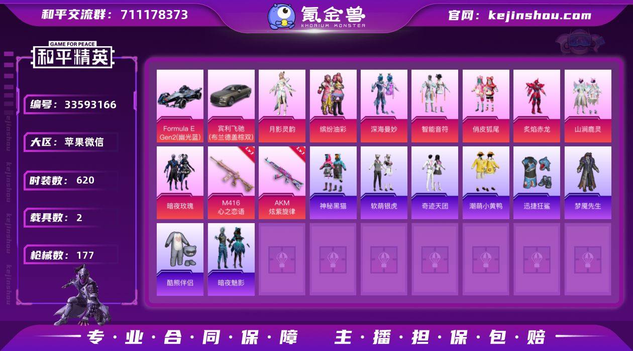 8粉装 3特效枪 2载具 7印记 可二次 可修改实名 【热门装扮】月影灵韵,缤纷油彩(猪妹猪脸妹),深海曼妙,智能音符,俏皮狐尾,炙焰赤龙,山涧鹿灵,暗夜玫瑰,神秘黑猫,软萌银虎,奇迹天团,潮萌小黄鸭,迅捷狂鲨,梦魇先生,酷熊伴侣,暗夜魅影 【载具】Formula E Gen2(幽光蓝),宾利飞驰(布罗德盖棕双色) 【稀有枪皮】Kar98K-巳巳如意,M416心之恋语,AKM炫紫旋律 【七级特效枪】七级AKM-炫紫旋律,七级M416-心之恋语 【五级特效枪】五级Kar98K-巳巳如意 【紫色装扮】极速红龙,格斗先锋,沙漠兵团,坚韧舞者,圣诞大吉,和平特警,夜莺强袭者,北国孤狼,刚毅裁决者,凛冬战士,战地菁英,怒火燎原,完美偶像,幻世战舞者,帅气教官,湖蓝色名流,破蛋小黄鸡,甜蜜告白,甜蜜熊情侣,甜蜜菠萝,疯狂小兔子,白色伏地魔,狂沙舞者,神秘领域,福星高照,空投萌叽,竞技勇士朋克,竞技达人朋克,绮丽涂鸦,海滨突袭者,滨海假日,滨海厨神,潮流炫酷,灰色格斗者,热血青春,牛气冲天,牛气满满,特战装甲,特殊使命,特训学院,冷焰舞者,SS21特训,茉莉之诺,飞驰魅影,音速流光,SS19特训,SS20特训,冰川特警,SS2特训,SS3特训,SS4特训,SS5特训,冰原使者,SS33特训套装,SS30特训套装,SS31特训套装,SS36特训,狙击之神,霓虹街区,金鼠迎春,长空...