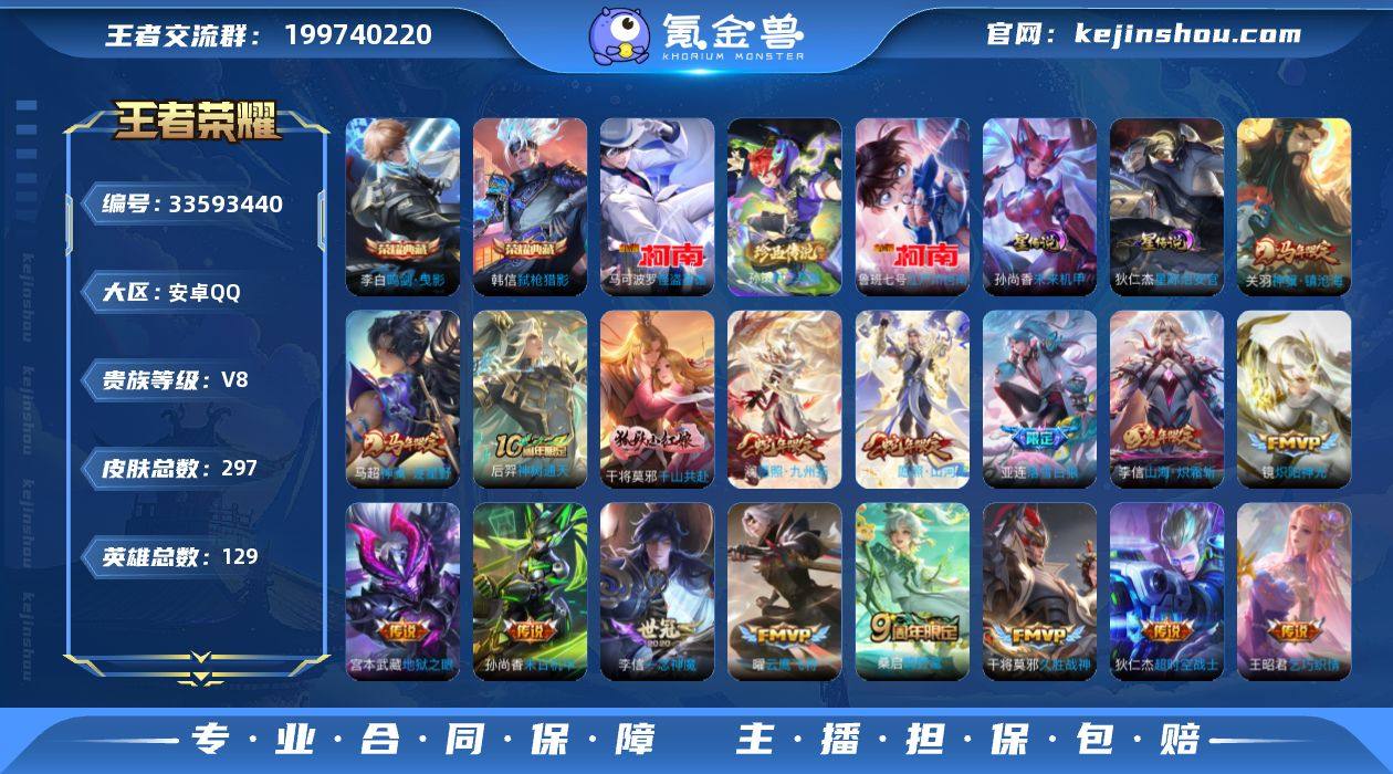 捡漏精品皮肤号 限定多多 王者印记数量19+星传说数量2+铭文150级+按键12+亲密度道具200+ 安卓Q-V8-至尊星耀III段位-129英雄-297皮肤-2典藏皮肤-3珍品传说-22传说-101史诗 【英雄全皮】:刘禅全皮,孙权全皮,敖隐全皮,司空震全皮,影全皮 【荣耀典藏】:李白鸣剑曳影,韩信弑枪猎影 【珍品传说】:孙策时之奇旅,鲁班七号江户川柯南,马可波罗怪盗基德 【传说皮肤】:关羽神骥镇沧海,马超神骥逐星野,后羿神树通天,干将莫邪千山共赴,司空震愿照山河定,澜愿照九州拓,桑启鸣野蒿,亚连落雪白狼,李信山海炽霜斩,王昭君乞巧织情,李元芳飞鸢探春,铠绛天战甲,镜炽阳神光,虞姬启明星使,曜云鹰飞将,李信一念神魔,张良黄金白羊座,干将莫邪久胜战神,梦奇胖达荣荣,孙尚香末日机甲,宫本武藏地狱之眼,狄仁杰超时空战士 【限定皮肤】:姜子牙天穹之誓,杨戬破阵退雄兵,狄仁杰阴阳师,赵云皇家上将,赵云百木心枪,庄周高山流水,高渐离死亡摇滚,元歌无心,狄仁杰魔术师,狄仁杰万华元夜,达摩沙漠行僧,项羽海滩派对,老夫子醍醐杖,程咬金演武夺筹,韩信飞衡,韩信傲雪梅枪,兰陵王金庭之子,花木兰瑞麟志,花木兰默契交锋,孙悟空孙行者,后羿辉光之辰,后羿圣弓游...