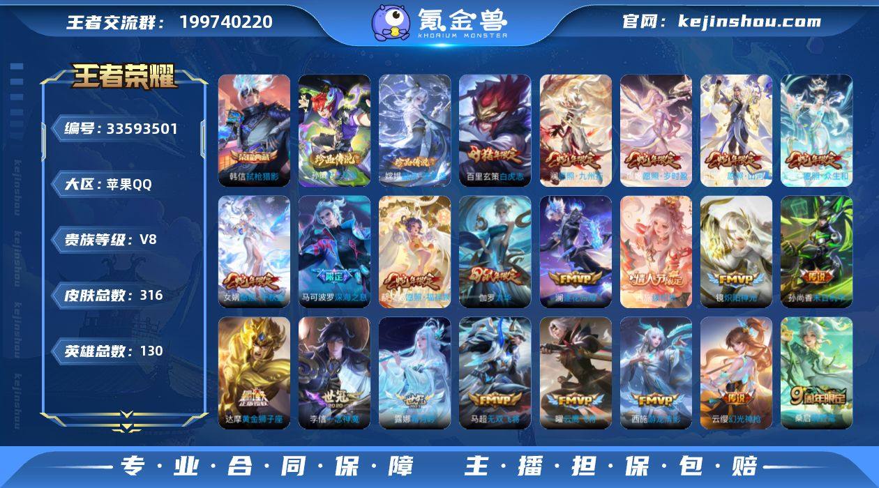 实名: 可修改 性别: 男号 贵族等级: V8 英雄数: 130 皮肤数: 316 荣耀水晶: 弑枪猎影 珍品传说: 时之奇旅-孙策,器灵·落星盏 传说皮: 黄金狮子座,云鹰飞将,猫影幻舞,炽阳神光,一念神魔,末日机甲-孙尚香,仲夏夜之梦,时之恋人-刘备,游龙清影,无双飞将,霜月吟,澜逐花归海,幻光神枪,续相思 限定皮: 遇见飞天,李小龙,游园惊梦,梁祝,岱宗,太华,逐梦之光,白虎志,至尊宝,一生所爱,大圣娶亲,深海之息,五谷丰年,鸣野蒿,愿照·千秋盛,愿照·众生和,愿照·山河定,愿照·岁时盈,愿照·福禄聚,愿照·九州拓 亮点: 【优质装备】:弑枪猎影(韩信典藏),器灵·落星盏,黄金狮子座,云鹰飞将(小将军),猫影幻舞,炽阳神光,一念神魔,末日机甲-孙尚香(绿蚂蚱),仲夏夜之梦(大飞蛾),时之恋人-刘备(电焊工),游龙清影(小青龙),无双飞将,霜月吟,澜逐花归海,涂山容容