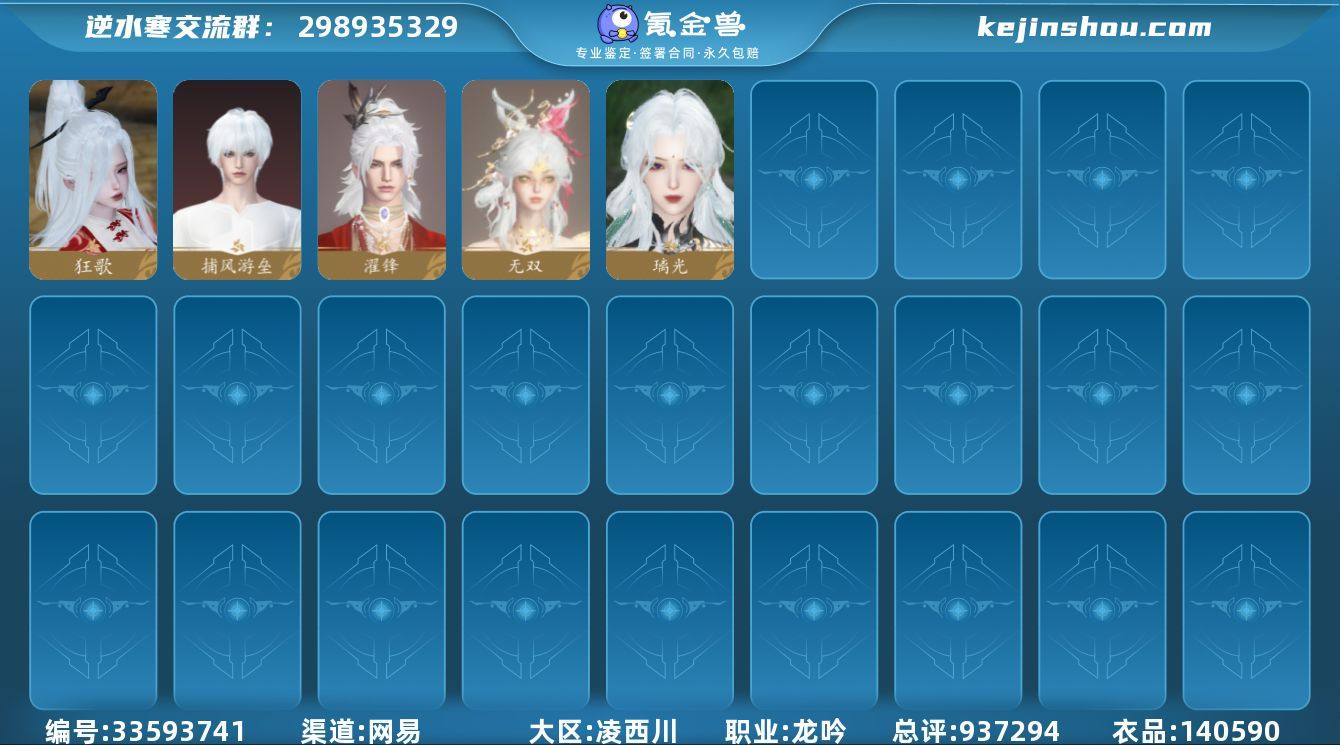 【区服】 天府之国 【充值称号】 凭栏听雨 【已用天赏石】 8 【天霓染数量】 1 【天霓染】 南时*1 【天赏发型】 捕风游垒, 濯锋, 无双, 璃光, 狂歌 【天赏外观】 雷霆武器 【副本外观】 白夜拂雪*1, 星剑分野 【配饰】 夜阑玄翼 【商城外观】 雾蓝星瞳, 纯白月光, 逸夏浮澜, 羽信絮梦, 诗剑纵歌, 千星咏叹, 跃动心芒, 灵语星彩, 玄喵夜行, 乌夜禁巡, 星宫遐音, 贪狼摄星, 开阳执戈, 金祷颂晖, 玉泽凌烟, 赤狐魅语, 圣月沉夜, 苍龙浮山, 鱼龙鳞潜, 白灵幻尘, 极夜天曦, 燕回南山, 暮云苍野 【祥瑞坐骑】 风行·万灯明, 纵风甲车·赤, 云螭·金玉纳福, 抟乌镇妖, 云螭·再浪一夏, 奔虹赤, 云螭·烹鲜炊黍, 龙衔瑞焰, 甜点鼠鼠, 呆宝, 金冠鼠鼠, 布丁, 粉黛娇, 幻琉晶, 风行·江湖景, 狂霸天, 风行·世间情, 星河转·金夕, 星河转·赤夜, 伯力, 咩郎, 瓜皮, 霸霸, 墨流云·玄色, 墨流云·靛青, 彩虹小马, 墨流云·朱红, 犬威哮月, 犬威哮月·沧, 犬威哮月·焰, 玉霄飞练, 绒绒夜, 隐云涧, 逍遥游, 空山闲 【武器环身】 剑渡东海 【灵韵内功】 断金戈, 燎野, 凛风绝刃, 不动明王, 淬锋镝, 灼锋净域, 破重云, 破釜 【铜币数量】 1604天赏石外观: 白发狂歌,璃光,无双,濯锋,捕风游垒