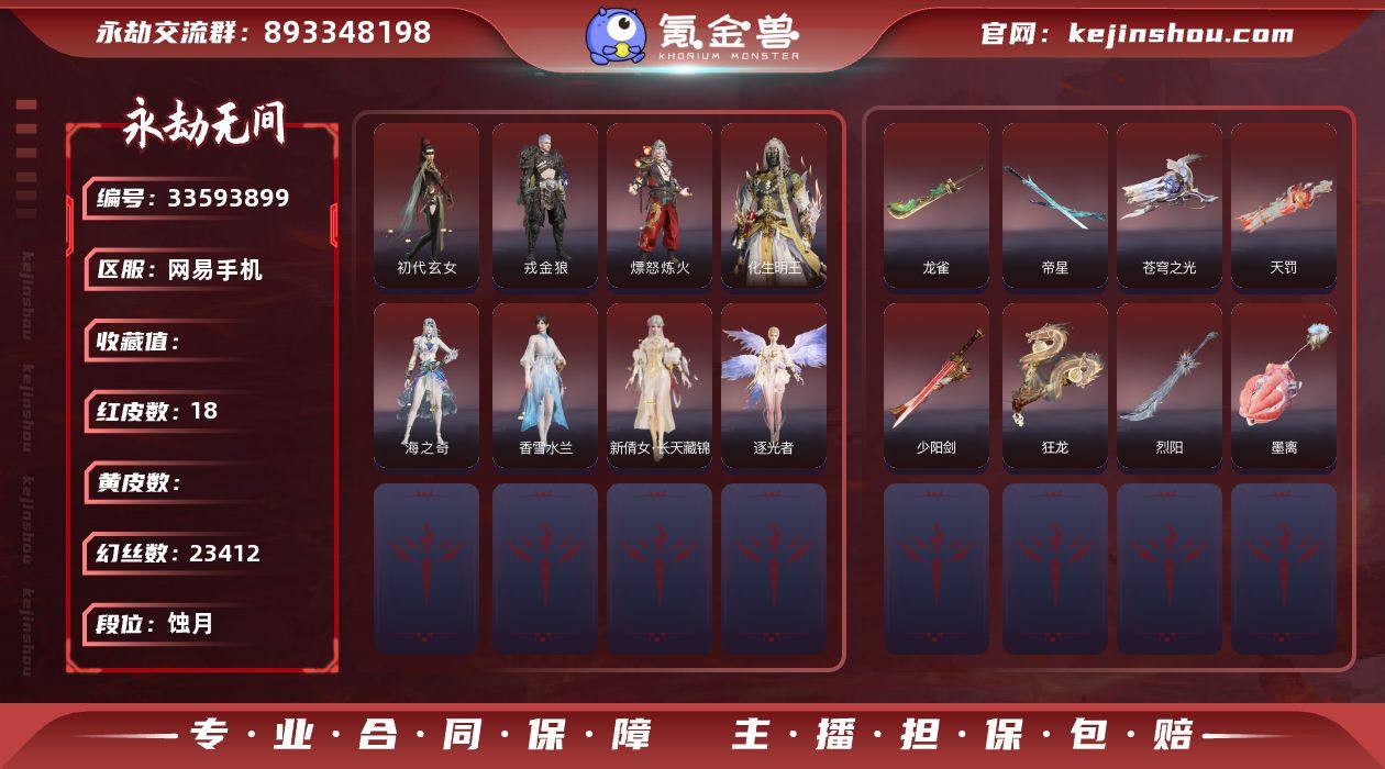 WJ6154,网易手机,5月19可换绑,三人段位蚀月3,1谪星,18红,665金,声望3,谪星信手斩龙,2孔,1黄,1蓝,等级508,收藏值368180,幻丝23412,通行证Lv4,变身器,荆魂,西行劫神君印,雪霜姿,拳皇勾玉,千秋匠心凶虎,揽九天,雷云敕雨令,守望先锋D.Va战斗机甲,御祥云,炎烈珠,红色神品,墨离,香雪水兰,逐光者,征天白龙,化生明王,新倩女幽魂长天藏锦,戎金狼,初代玄女,熛怒炼火,海之奇,天罚,苍穹之光,帝星,龙雀,烈阳,狂龙,少阳剑,2674超越型紫,角色金色皮肤,P5R雨宫莲JOKER,黄庭道,封神录申公豹,金羽客,玉漱冰骢,墨染千秋剪春漪,禄运玉霄,金襦玉衫,夏日派对仲夏霜华,赤丹朱湛,寒英素雪,麟鹿大铠,花之倾奇,苍雷丸,共赴无间赤焰舞影,倒反阴阳凛冬,巅峰极速蕾雅,神鹰之女,火罗圣女,惊云羽,浣烟纱,蜃楼魅影,璨银魔枭,逆水寒夜行,福瑞天泽,冬无归,怦然心动音律织光,秋藏桂,P5R奥村春NOIR,绿野守护悠竹萌客,楚韵九歌山鬼,街头狂欢涂鸦少女,共赴无间幽夜玲珑,春不敛,赤阳天狐,塔罗序衔环,卷王,长歌诗韵念奴娇,寿竹云春,夏日派对半夏晚风,湛卢,正法袍,赤诚心,云间影,夏日派对逐浪砂阳,赤焰战灵,绿野守护山漠...