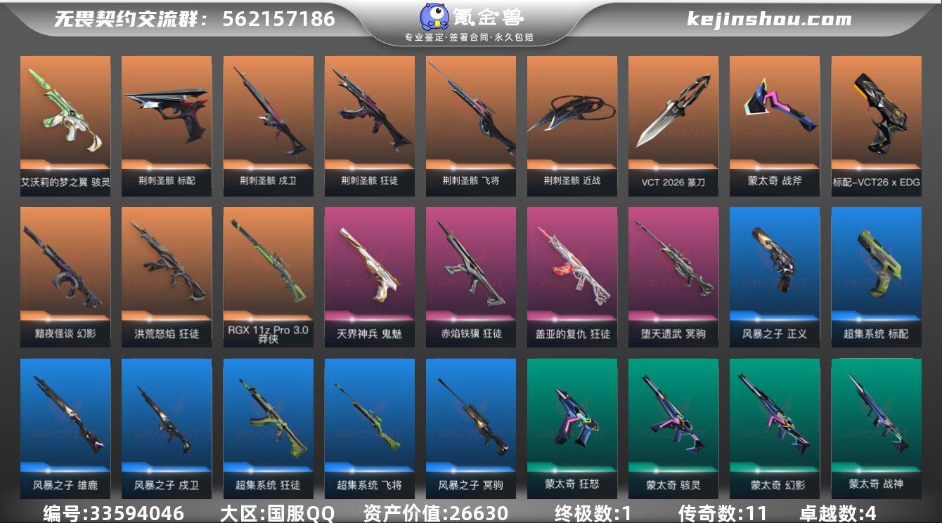 段位: 黄金 套装: 荆刺圣骸 近战武器皮肤: 蒙太奇 战斧,VCT 2026 篆刀,荆刺链刃-荆刺圣骸 步枪皮肤: 狂徒-盖亚的复仇,狂徒-洪荒怒焰,幻影-黯夜怪谈,超集系统 狂徒,蒙太奇 幻影,风暴之子 戍卫,狂徒-赤焰铁骥,狂徒-荆刺圣骸,戍卫-荆刺圣骸 佩枪皮肤: 鬼魅-天界神兵,标配-VCT26 x EDG,超集系统 标配,风暴之子 正义,蒙太奇 狂怒,标配-荆刺圣骸 狙击枪皮肤: 冥驹-堕天遗武,莽侠-RGX 11z Pro 3.0,风暴之子 冥驹,超集系统 飞将,飞将-荆刺圣骸 冲锋枪皮肤: 骇灵-艾沃莉的梦之翼,蒙太奇 骇灵 霰弹枪皮肤: 风暴之子 雄鹿 机枪皮肤: 蒙太奇 战神 亮点: 【优质装备】:狂徒-盖亚的复仇,冥驹-堕天遗武,狂徒-洪荒怒焰,幻影-黯夜怪谈,骇灵-艾沃莉的梦之翼,鬼魅-天界神兵