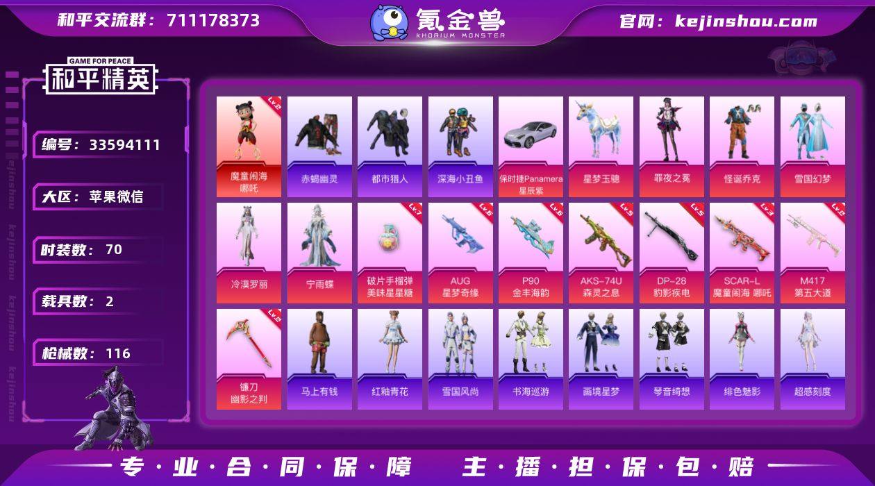 【LHPD842】【店主推荐捡漏号!可直接换绑】苹果 微信-1神装-5粉装-8特效枪-2载具-3粉色飞行器-39952热力值-4王牌印记-70套装-116枪皮【红色神装等级】:魔童闹海-哪吒(二级)【红色角色神装】:魔童闹海-哪吒【热门品类】:粉装-怪诞乔克,粉装-雪国幻梦,套装-赤蝎幽灵,套装-都市猎人,套装-深海小丑鱼,套装-暗影哥特,角色-Mark.06【粉色套装】:粉装-怪诞乔克,粉装-雪国幻梦,角色-冷漠罗丽,角色-宁雨蝶,角色-罪夜之冕【粉色枪皮等级】:SCAR-L-魔童闹海 哪吒(三级),AUG-星梦奇缘(六级),AKS-74U-森灵之息(五级),P90-金丰海韵(六级),M417-第五大道(二级),DP-28-豹影疾电(五级),镰刀-幽影之判(二级),破片手榴弹-美味星星糖(七级)【粉色载具】:保时捷Panamera(星辰紫),星梦玉骢【粉色枪皮】:SCAR-L-魔童闹海 哪吒,AUG-星梦奇缘,AKS-74U-森灵之息,P90-金丰海韵,M417-第五大道,DP-28-豹影疾电,镰刀-幽影之判,破片手榴弹-美味星星糖【粉色飞行器】:炫彩糖果飞行器,宁雨蝶飞行器,飞天猪飞行器