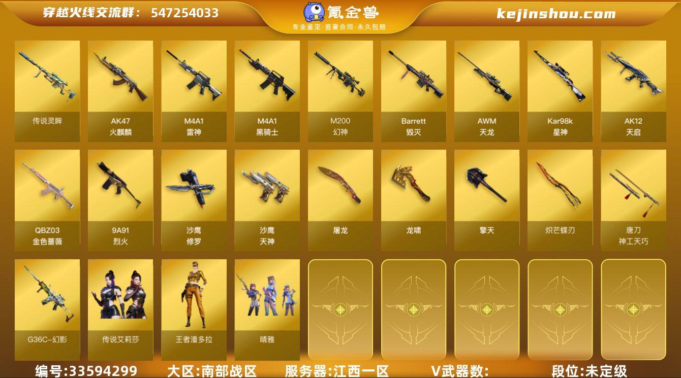 实名: 不可修改 V武器: AK47-火麒麟,M4A1-雷神,M4A1-黑骑士,Barrett-毁灭,AWM-天龙,M200-幻神,Kar98k-星神,AK12-天启,QBZ03-金色蔷薇,9A91-烈火,沙鹰-修罗,沙鹰-天神,屠龙,龙啸,擎天,柯尔特-冠军之特,USP神工天巧,唐刀神工天巧,炽芒蝶刃,传说灵眸,G36C-幻影,龙啸-烈火龙威,烈火-动感闪耀,天神-动感闪耀,屠龙-动感闪耀,AK47-黑武士-锦绣游龙,无影-神兵利器,雷霆之锋,M4A1-赤狱骑士,金色蔷薇-狼王,M4A1-水晶,EVOⅢ-序章,M200-玄龙 王者武器: 王者之势-觉醒版,王者之鲨-觉醒版,王者风神-觉醒版 热门武器: Cat-刀锋,COP-白鲨 狙击枪稀有皮肤: 毁灭-冠军之怒,天龙-能量核心,M200-幻神-荣耀世冠白鲨,幻神-动感闪耀 皮肤,星神-巅峰荣耀 英雄角色: 传说艾莉莎,晴雅,王者潘多拉,零·纪元 音效道具: 白鲨语音包,天神动感闪耀音效卡,烈火动感闪耀音效卡