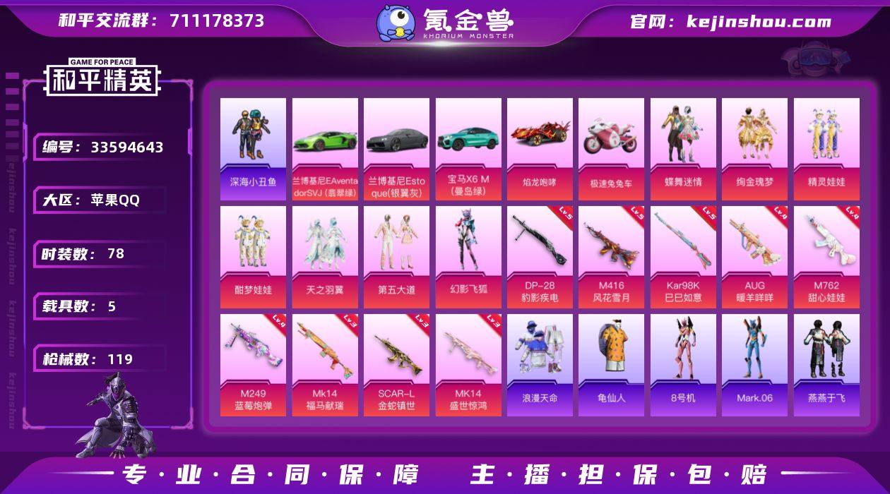 【LHPD868】【店主推荐捡漏号!可直接换绑】苹果 手Q-7粉装-9特效枪-5载具-5粉色飞行器-47068热力值-6王牌印记-78套装-119枪皮【热门品类】:套装-浪漫天命,套装-深海小丑鱼,套装-龟仙人,角色-8号机,角色-Mark.06【粉色套装】:粉装-蝶舞迷情,粉装-绚金瑰梦,粉装-精灵娃娃,粉装-酣梦娃娃,粉装-天之羽翼,粉装-第五大道,粉装-幻影飞狐【粉色枪皮等级】:SCAR-L-金蛇镇世(三级),M416-风花雪月(五级),AUG-暖羊咩咩(四级),M762-甜心娃娃(四级),Kar98K-巳巳如意(五级),Mk14-盛世惊鸿(三级),Mk14-福马献瑞(三级),M249-蓝莓炮弹(四级),DP-28-豹影疾电(五级)【粉色载具】:兰博基尼Aventador SVJ(翡翠绿),兰博基尼Estoque(银翼灰),宝马X6 M(曼岛绿),焰龙咆哮,极速兔兔车【粉色枪皮】:SCAR-L-金蛇镇世,M416-风花雪月,AUG-暖羊咩咩,M762-甜心娃娃,Kar98K-巳巳如意,Mk14-盛世惊鸿,Mk14-福马献瑞,M249-蓝莓炮弹,DP-28-豹影疾电【粉色飞行器】:天之羽翼飞行器,星夜魔法师飞行翼,凤舞九天飞行器,万象金身飞行器,彩虹独角兽飞行器